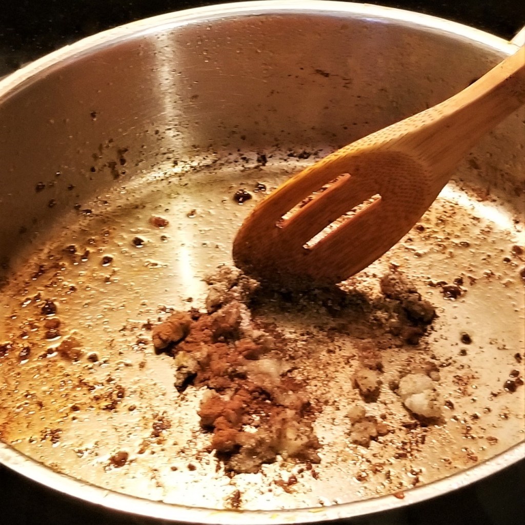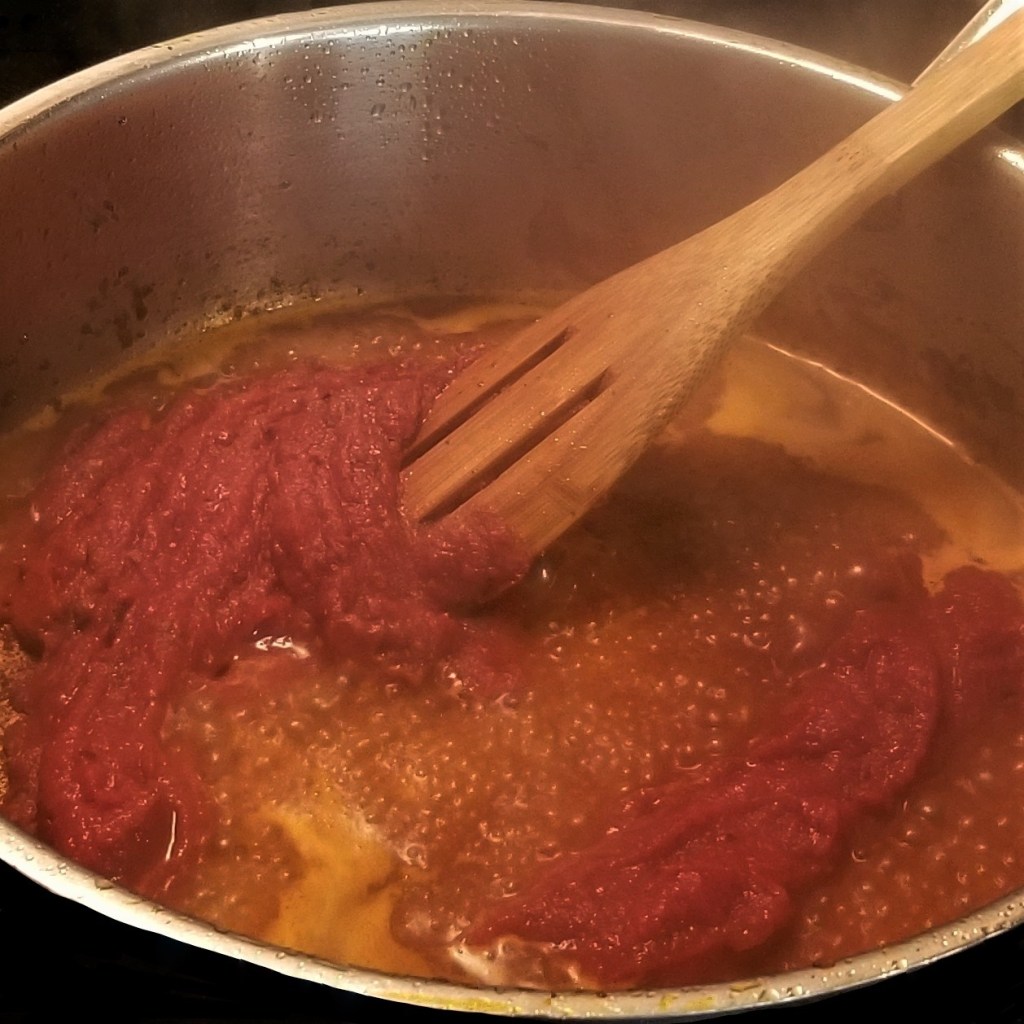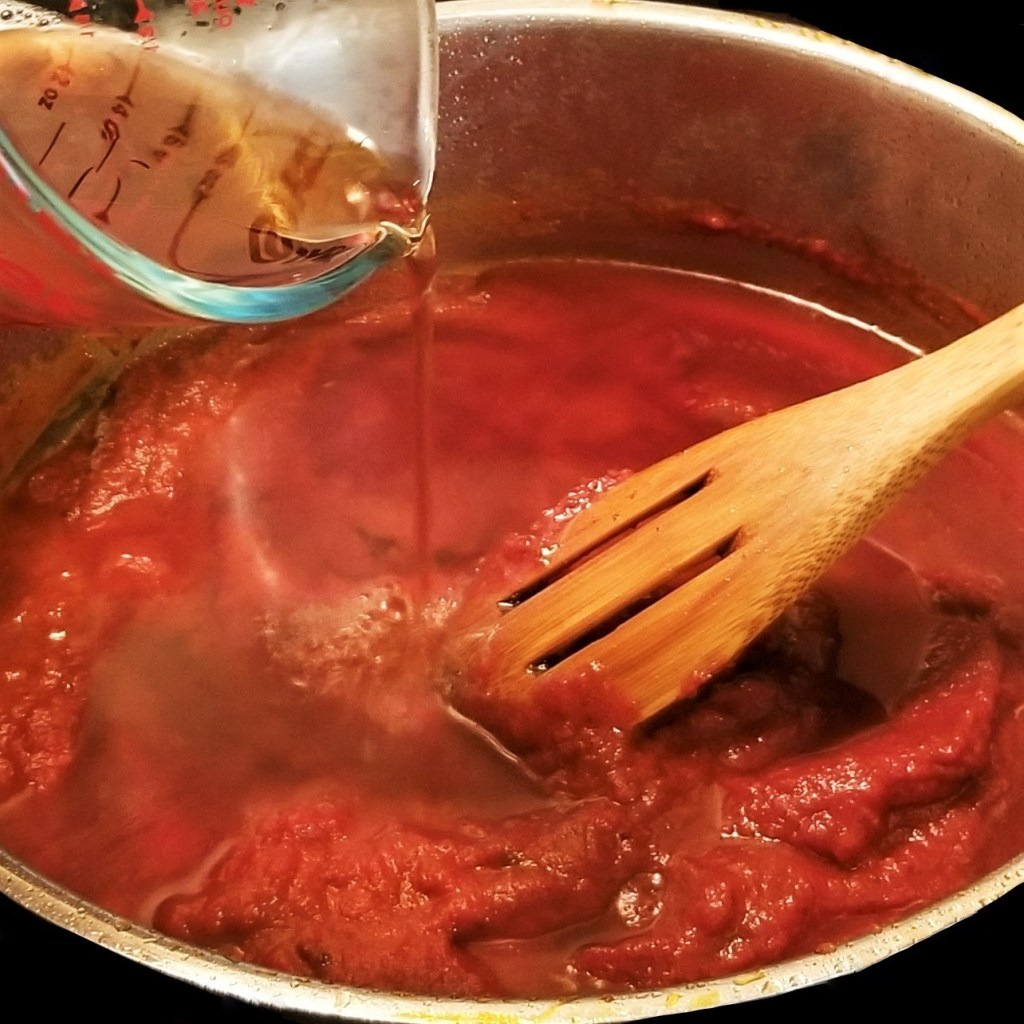 Add tomato paste, fry and mix with the seasonings for about one minute, then add half a cup of water, to deglaze the pan, scraping any bits from the bottom of the pan (photo below, left). In a cup, dissolve sugar in wine and one cup of water, then add to the pan and mix (photo below, right):