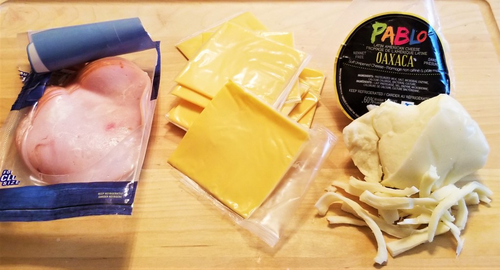 Veracruz style vol au vents – volovanes veracruzanos, come in many different flavours, such as chicken, chorizo, tuna, crab meat, etc., but the staple is a combination of ham, processed cheese and stringy cheese. For this recipe, I am using turkey slices, regular yellow processed cheese slices, and Oaxaca style cheese: