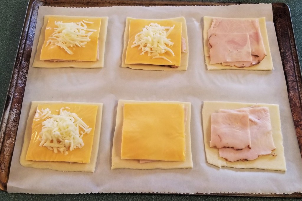 Arrange six squares on a baking sheet lined with parchment paper; place portions of cold-cut meat on each, then one slice of processed cheese, and top with a mound of shredded cheese: