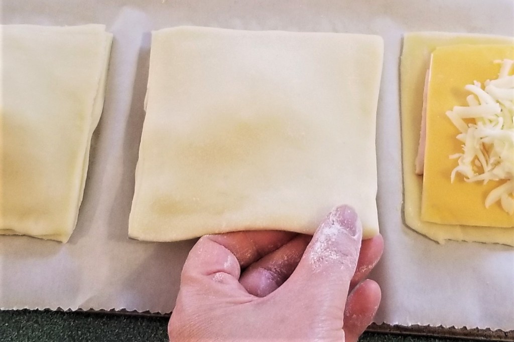 Place the rolled pastry squares on top of the squares with fillings and, using well-floured fingers, gently press together along the edge, to seal: