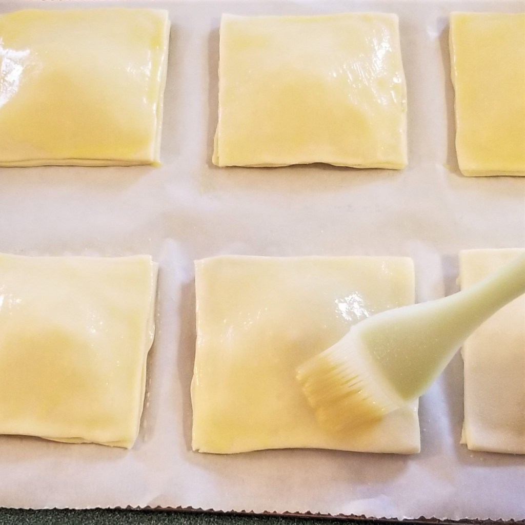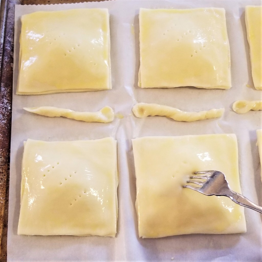Beat egg in a small bowl, and brush the top of the pastries (photo below, left). Pierce the top of each pastry several times with a fork, for venting hot air during baking (photo below, right):