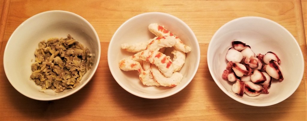 For my cocktail, I had canned baby clams (I saved the juice for the sauce); vegan shrimp (since I am allergic to crustaceans), and cooked octopus tentacles: