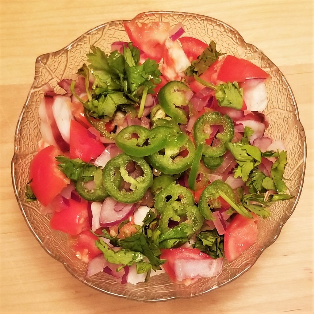 Reserve 2 shrimp whole for garnish, then slice the rest, and mix with the rest of the seafood in a thick glass goblet (see bottom of the post), or as in my case, in a glass serving bowl (photo below, left).  Layer tomatoes, onions, cilantro and serrano peppers on top (photo below, right):