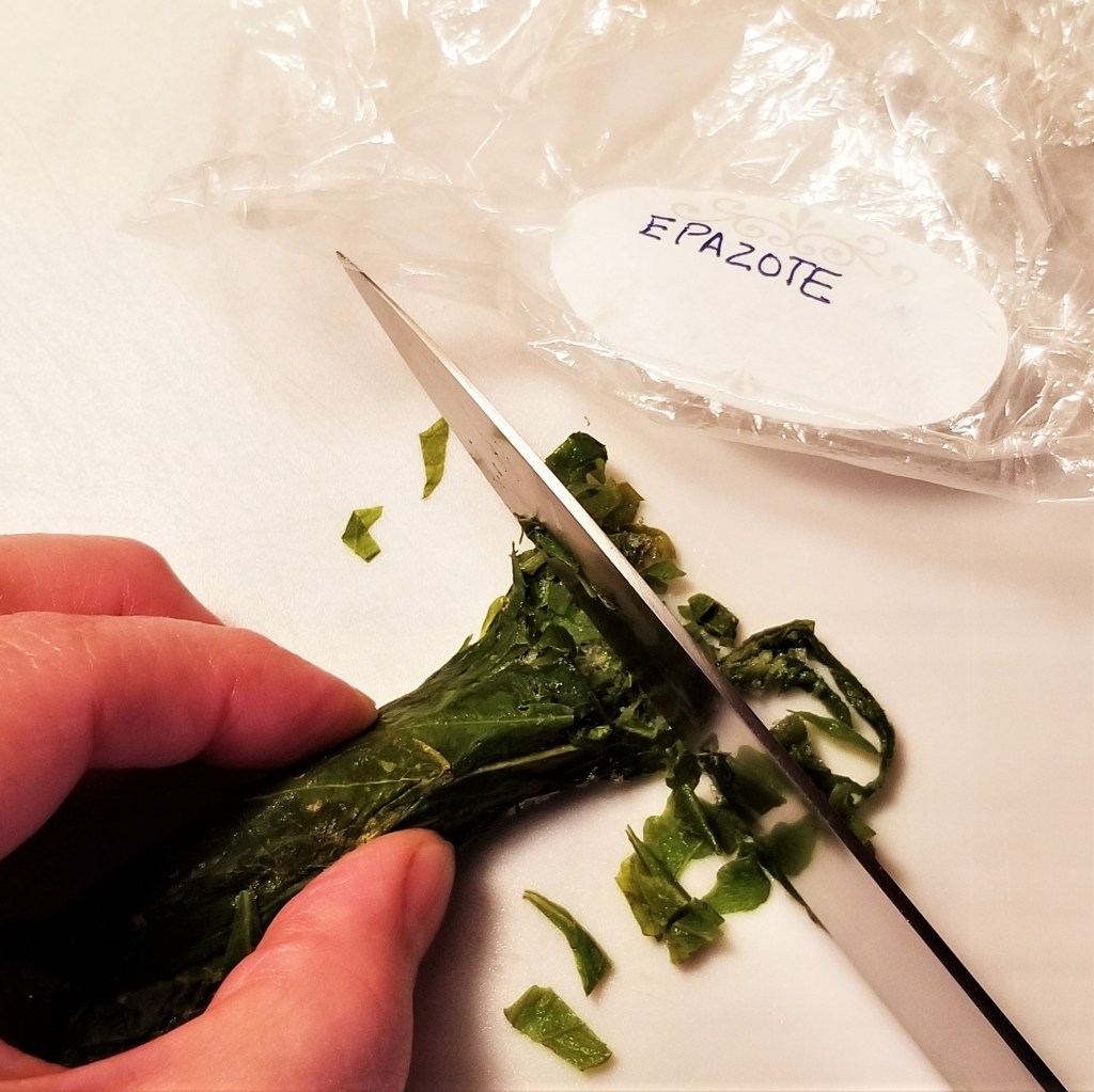 I had a mix of cremini and oyster mushrooms (photo below, left). I always freeze epazote from my herb garden, so I can have it handy even during the cold months; it is easy to just take it out of the freezer, and slice finely (photo below, right):