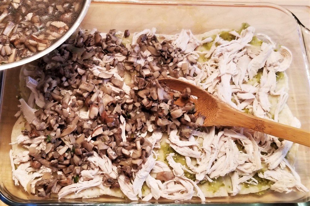 Spread half the shredded chicken, and half the sautéed mushrooms on top: