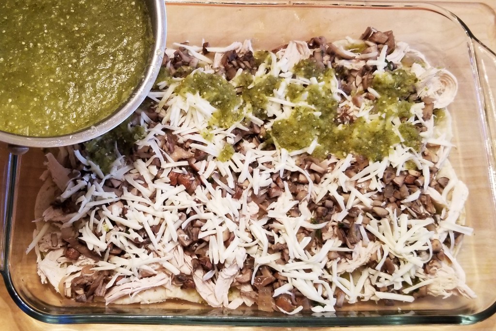 Repeat layers by stacking another six tortillas, half a cup of sauce, the rest of the chicken and mushrooms, half a cup of cheese, and another half a cup of sauce.