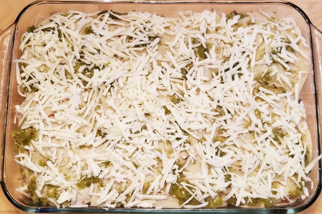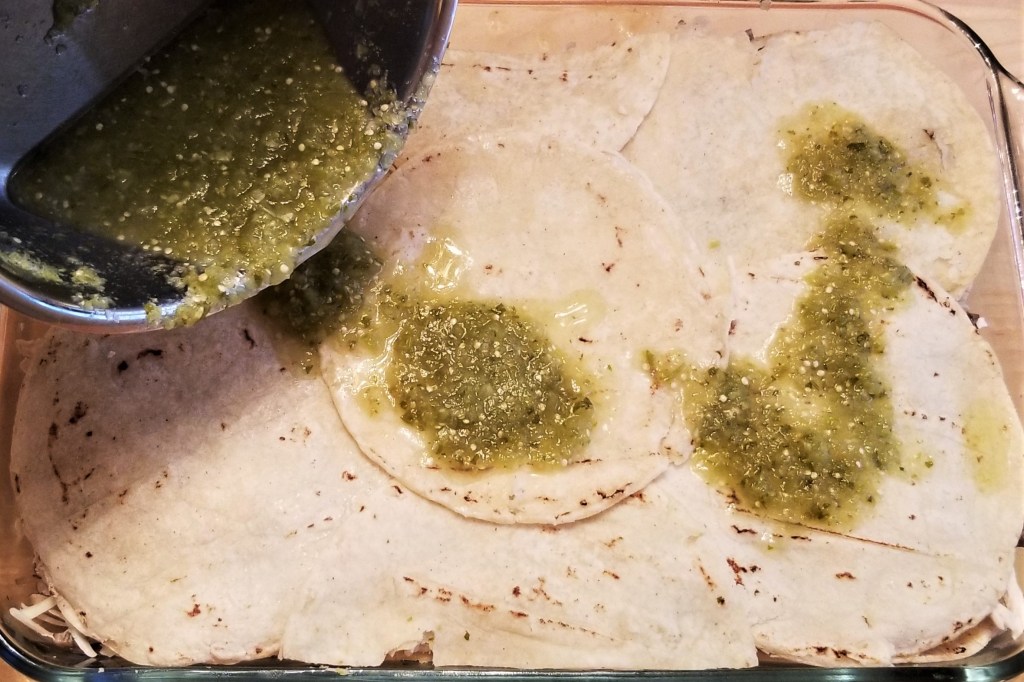 In a rectangular baking dish (9×13 inches, 23×33 cm), spread half a cup of green sauce, then arrange six corn tortillas, slightly overlapping, and slicing one in half to fit better, as shown below: