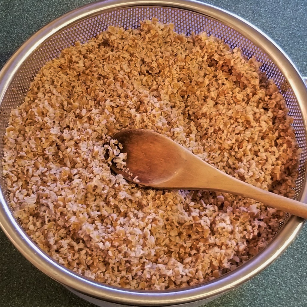 Place dry bulgur wheat in a large bowl (photo below, left). Add enough cold water to cover (photo below centre). Allow to soak for two to four hours, adding more water, as needed. Drain water by pouring into a colander, and pressing hydrated grains down with the back of a spoon (photo below, right):