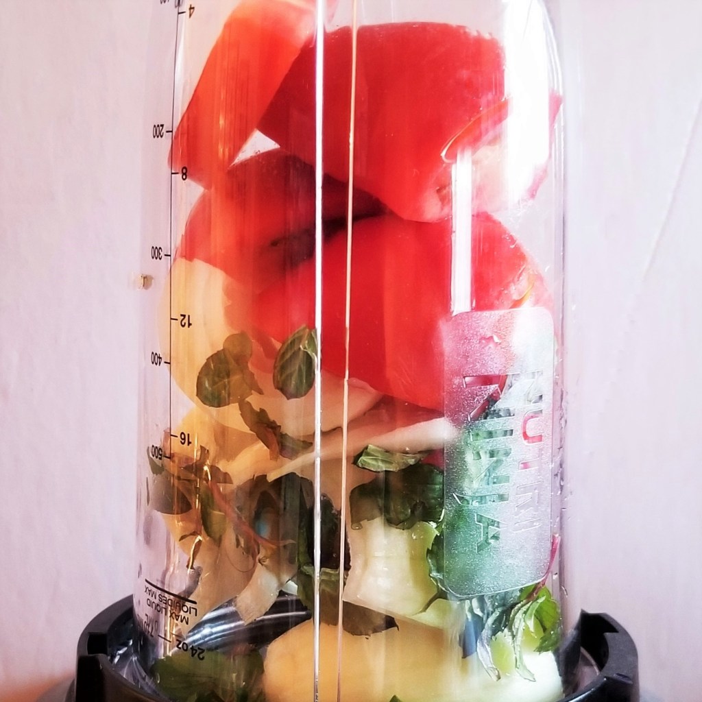 Once bulgur wheat is ready, place tomatoes, white onion and spearmint leaves in a blender jar (photo below, left). Process until smooth (photo below, right):