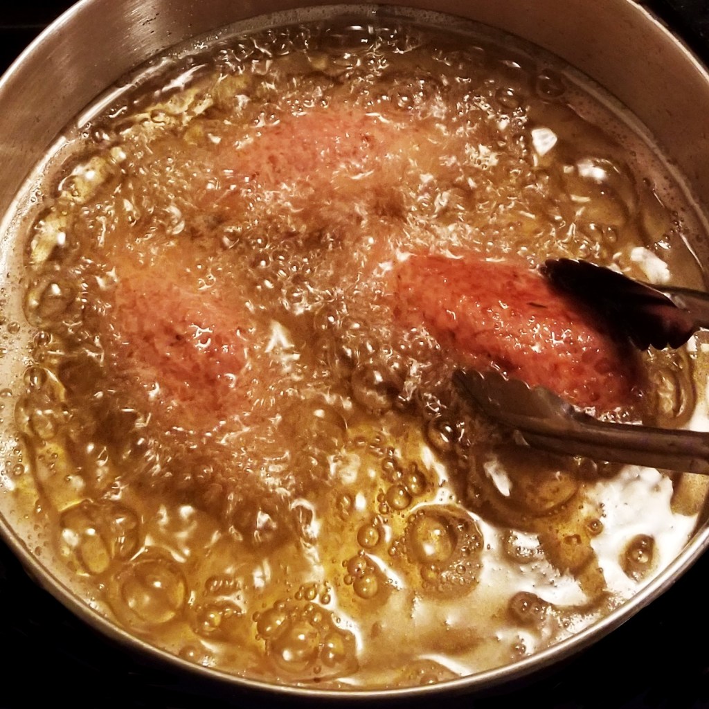 In a pot, pour enough oil for a depth enough to cover the patties; warm up over high heat until it starts to ripple (around 375ºF-190ºC). Add patties in batches, careful not crowd the pot; the oil should start bubbling (photo below, left). Flip the patties for an even browning, and remove once golden and crispy (photo below, right):