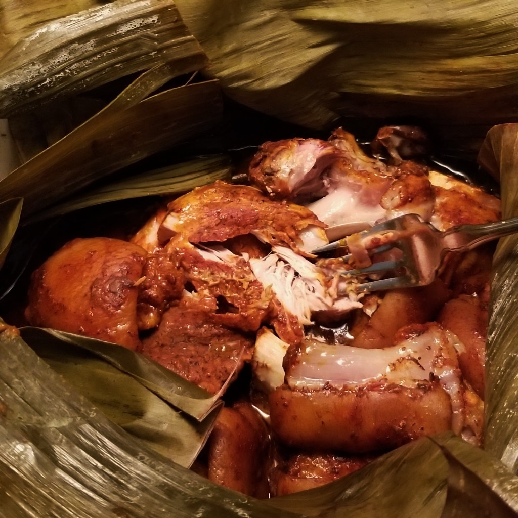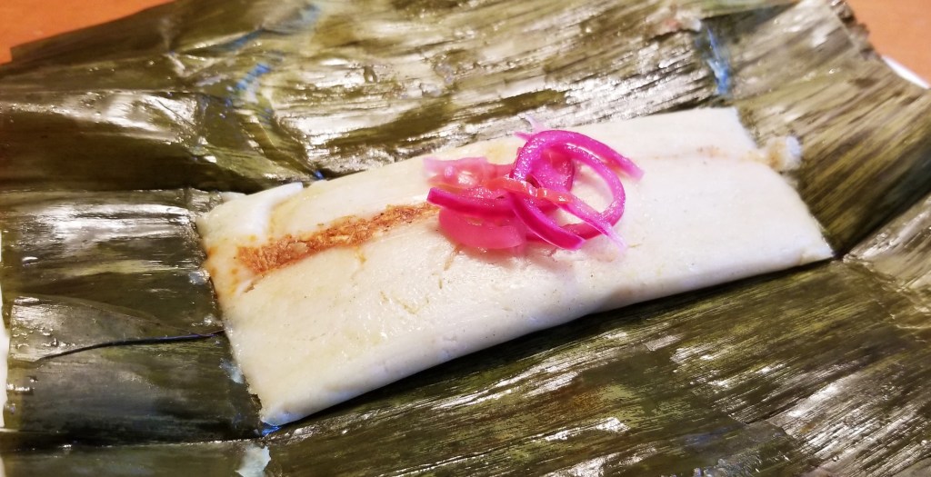 When sliced, the fully cooked tamales reveal a porous texture, and a delicious melding of flavours of nixtamalized corn and filling, complemented with the crunch and tangy flavour of the pickled onions: