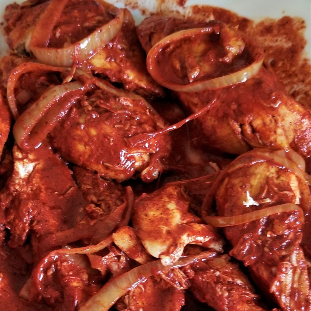 The filling is usually a type of meat cooked in an annatto seasoning called recado rojo. Click on the highlighted text for my recipes for pork in annatto seasoning (cochinita pibil) shown in the photo below, left, and chicken in annatto sauce (pollo pibil), photo below, right: