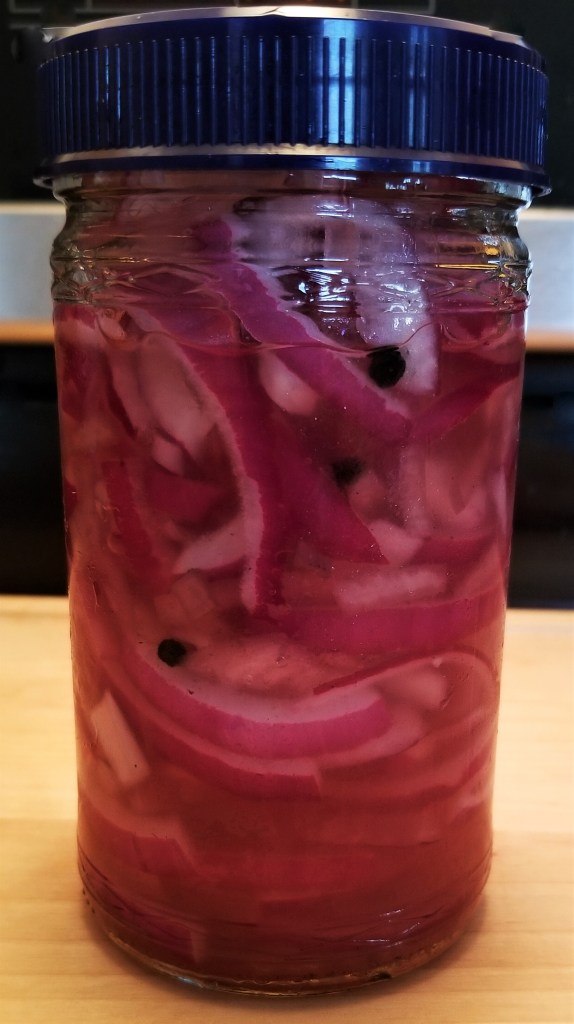 The topping may be (click on highlighted text for my recipes): A spicy Habanero and charred tomato sauce (chiltomate), or a red onion and Habanero condiment, or pickled red onions. I am using the latter, of which I often have a jar in the fridge that stays fresh for a couple of weeks.