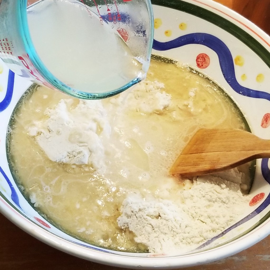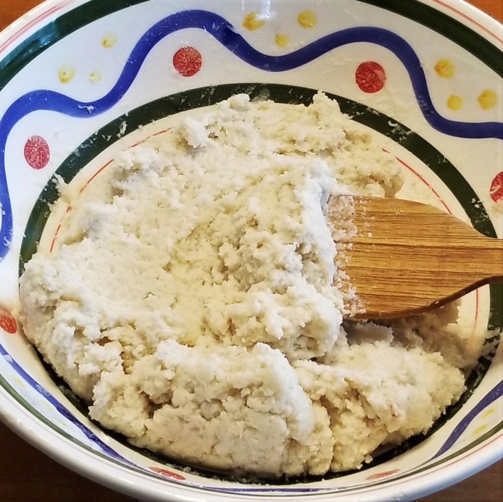 Prepare corn paste: Place corn (masa) flour, salt, and lard in a large mixing bowl, then pour in three cups of hot liquid (in my case chicken broth, photo below, left). Incorporate all ingredients with a spatula, or hands, adding more hot liquid, as needed, to obtain a firm – but still soft – smooth paste (photo below, right):