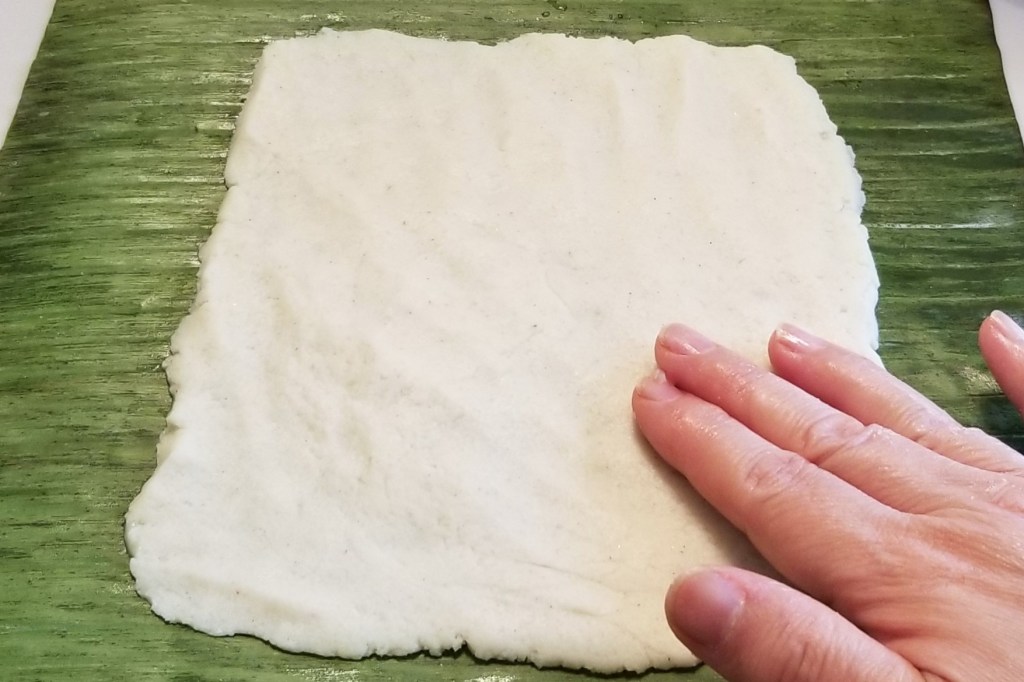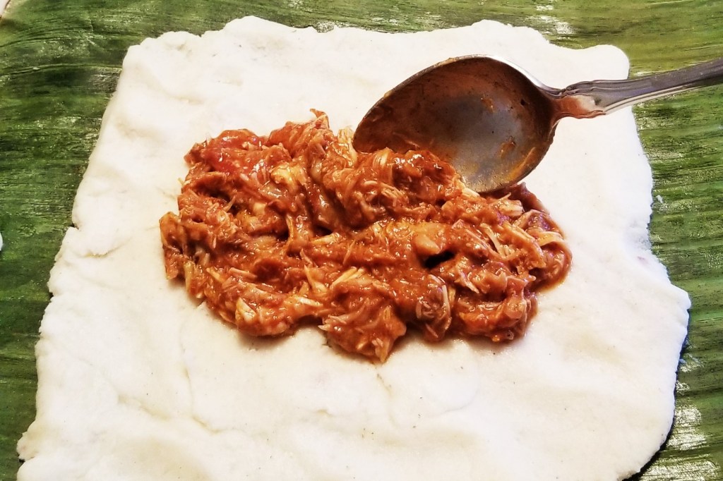 Once the banana leaves, filling and topping are ready, the tamales may be assembled.
