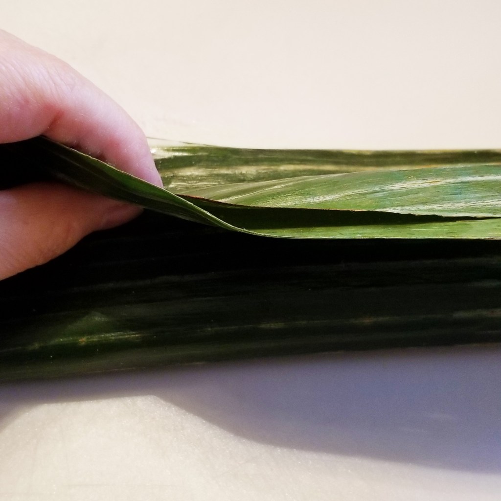 To prepare banana leaves, thaw in the fridge if frozen; wash and dry on both sides. Before using, the leaves must be roasted to make them pliable. Place a baking sheet on the stove over medium heat. Run the leaves over, with the smooth side facing up; the surface will quickly become shinny: