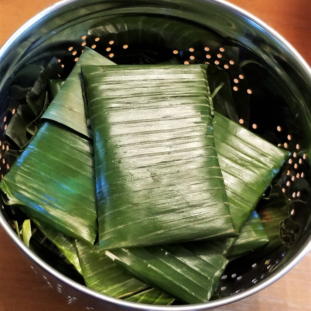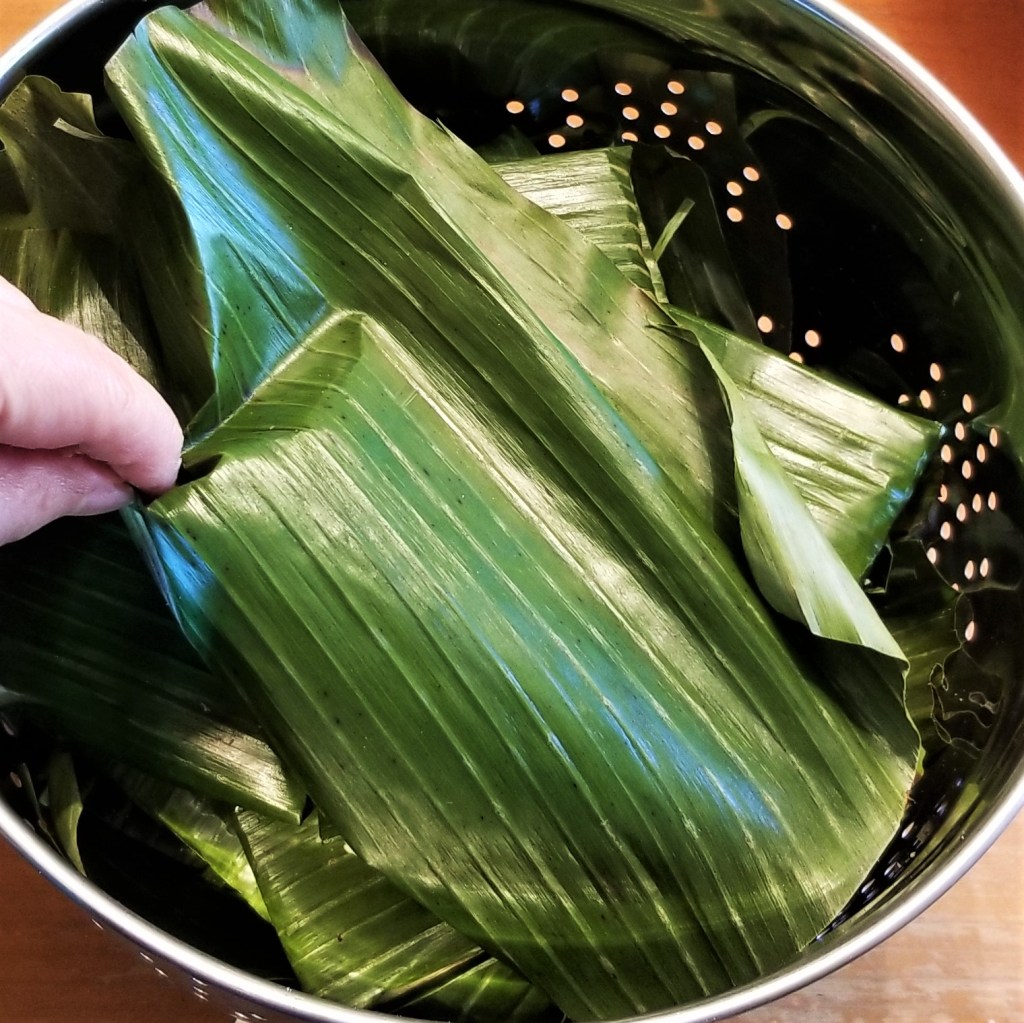 Roasted banana leaves, enough to get 8 pieces, each approximately a 10×10″ (25×25 cm) square, plus more for covering pot