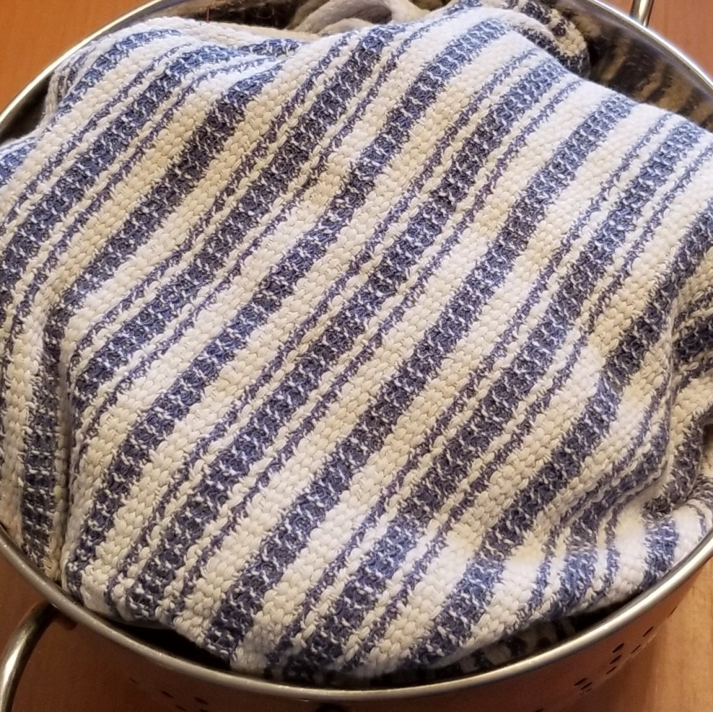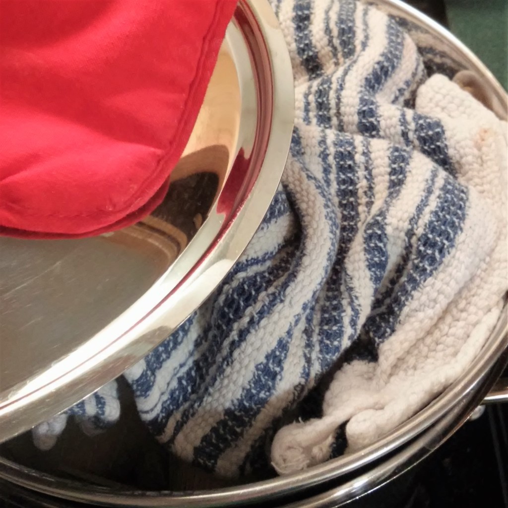Place lid on, completely closing the top (photo below, left). Cook over high heat to make sure the water is boiling, then reduce to a rolling boil, and let the tamales steam for at least one hour. I always check the bottom pot halfway through, to make sure the it is not drying too fast; if needed, add boiling water. After one hour, carefully open the pot and move towel to the side (photo below, right):