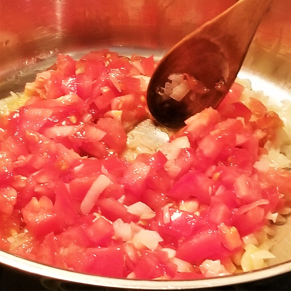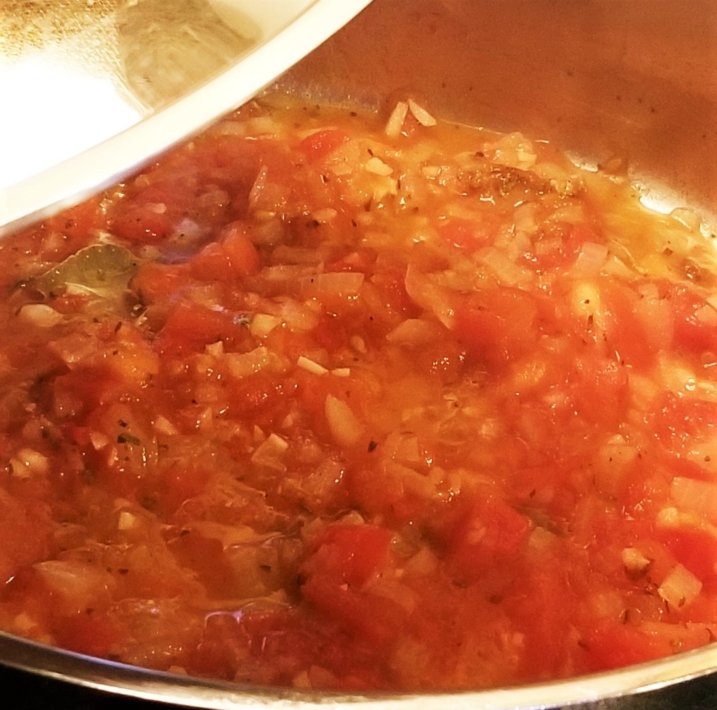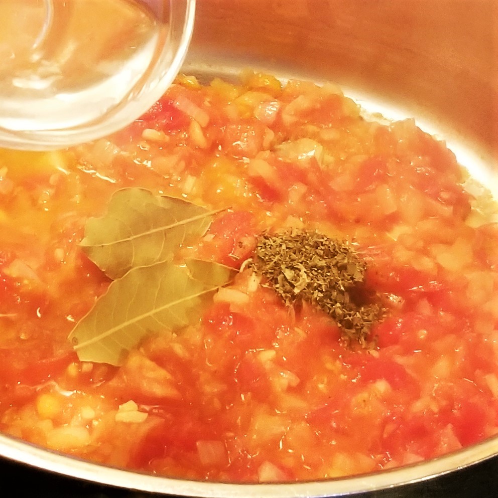 Prepare filling: In a large pan, warm up olive oil over medium heat; add onions and sauté for a few minutes, until translucent.  Add garlic and cook, stirring, for a few seconds, then incorporate tomatoes (photo below, left).  Allow to cook for five minutes, stirring occasionally, then add bay leaves, crumbled dry oregano, and water (photo below, right):