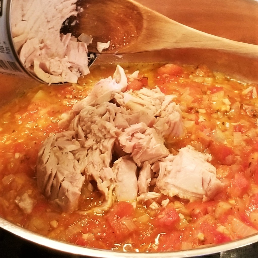 Stir to incorporate, then reduce heat to low, and cover pan (photo below, left).  allow to cook for ten minutes.  Uncover pan, and add drained tuna (photo below, right):