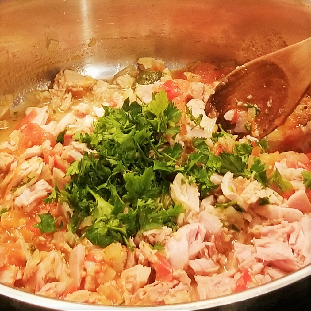 Stir to incorporate, then add chopped parsley (photo below, left).  Season with salt and pepper, to taste, and cook for a couple more minutes, stirring to avoid burning, until there is no liquid at the bottom of the pan (phot below, right):