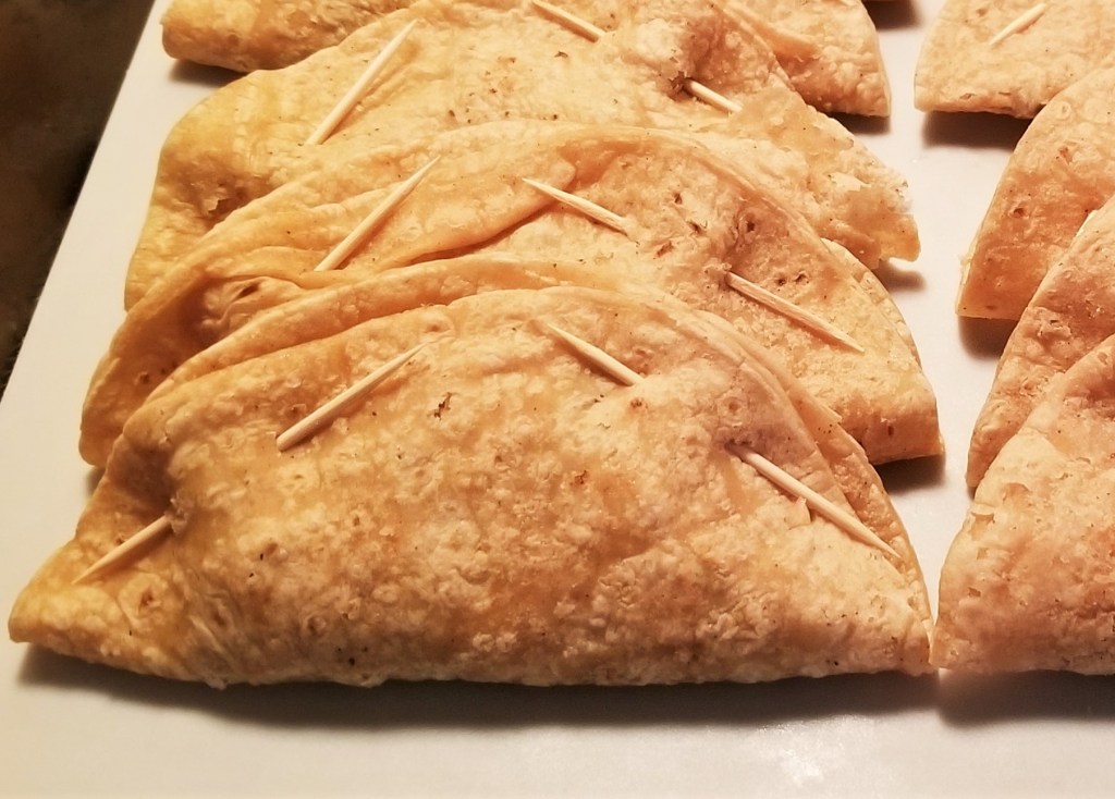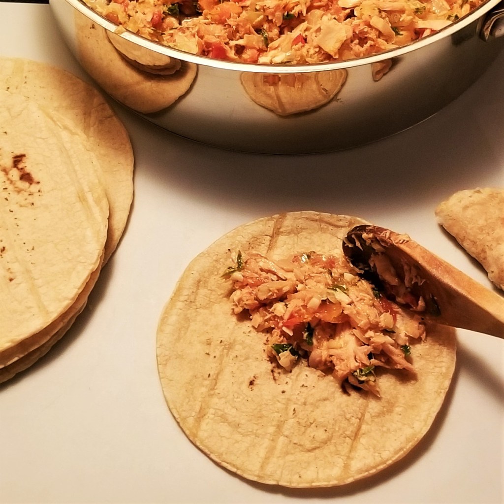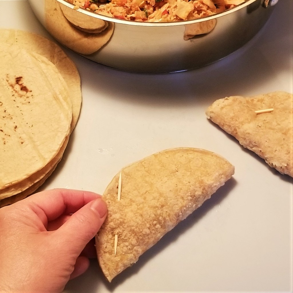 Assemble tacos:  Scoop some tuna filling onto a warm corn tortilla, spreading on one half, and leaving a rim around the edge (photo below, left).  Fold empty half over, to form a half circle, then secure the edges together with toothpicks (photo below, right):