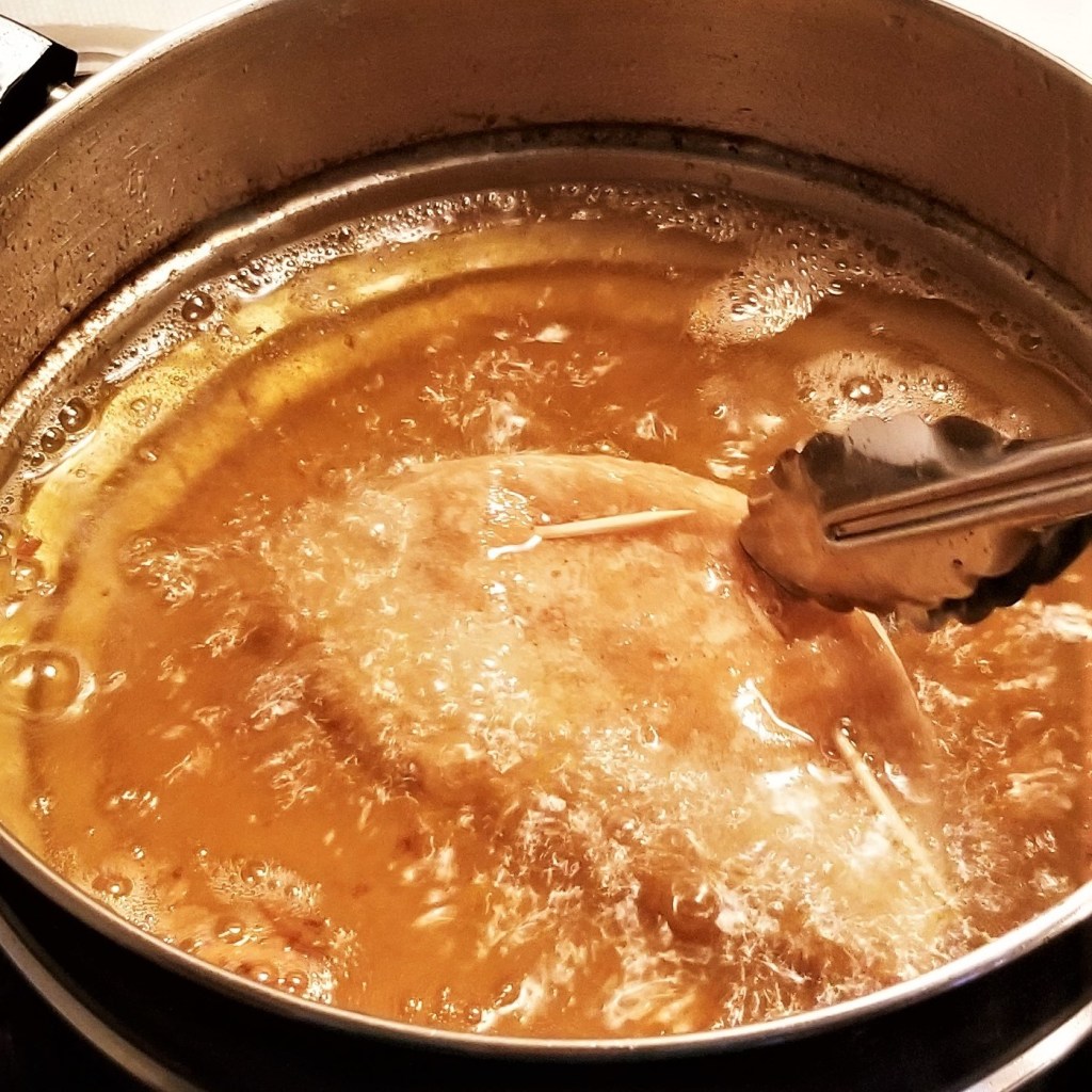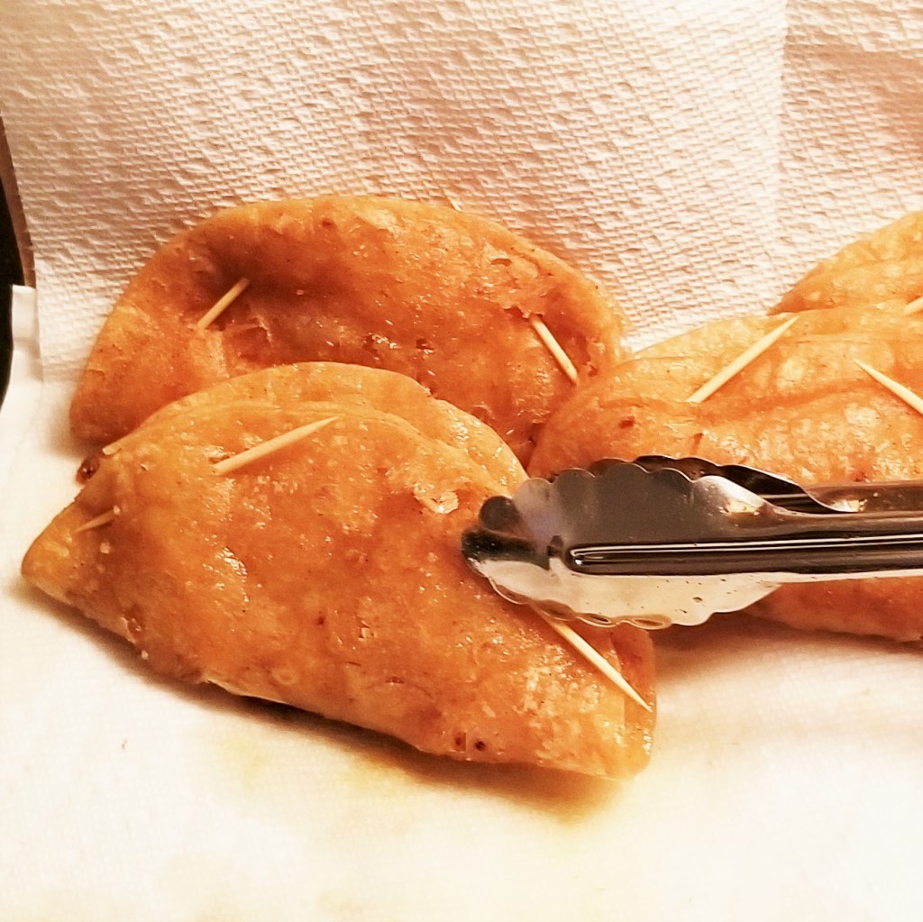Fry tacos right before serving:  Warm up a good amount of oil for deep frying (I use a small pot, to save oil) over high heat; once it starts rippling, reduce to medium-high.  Carefully fry tacos in batches for one or two minutes per side, until crispy and golden brown (photo below, left).  Transfer to paper towels, to drain excess oil (photo below, right):
