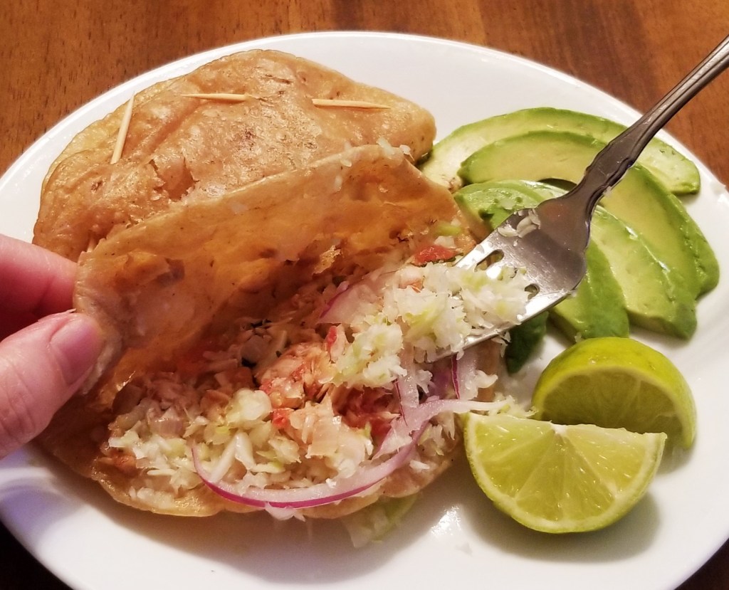 Each person may add avocado and a sprinkle of lime juice to their tacos, and also a few drops of bottled hot sauce, such as Valentina™, or Huichol™.  These delicious crispy tacos may be eaten as a snack or appetizer, but are also worthy for lunch or a light dinner.