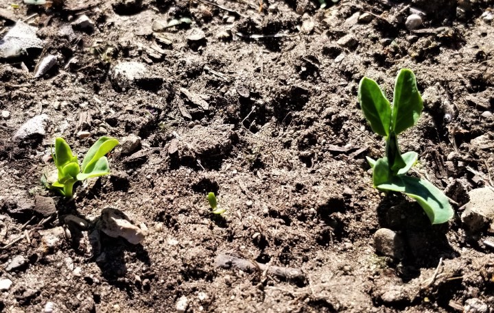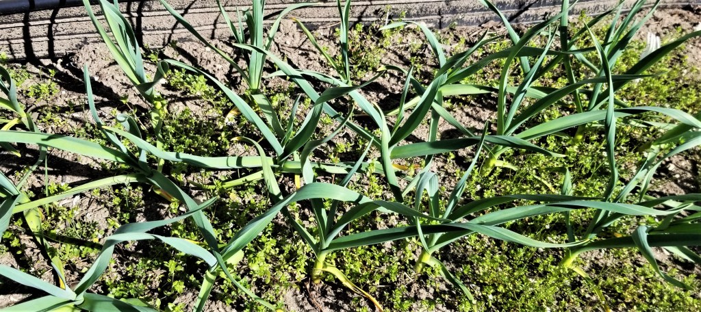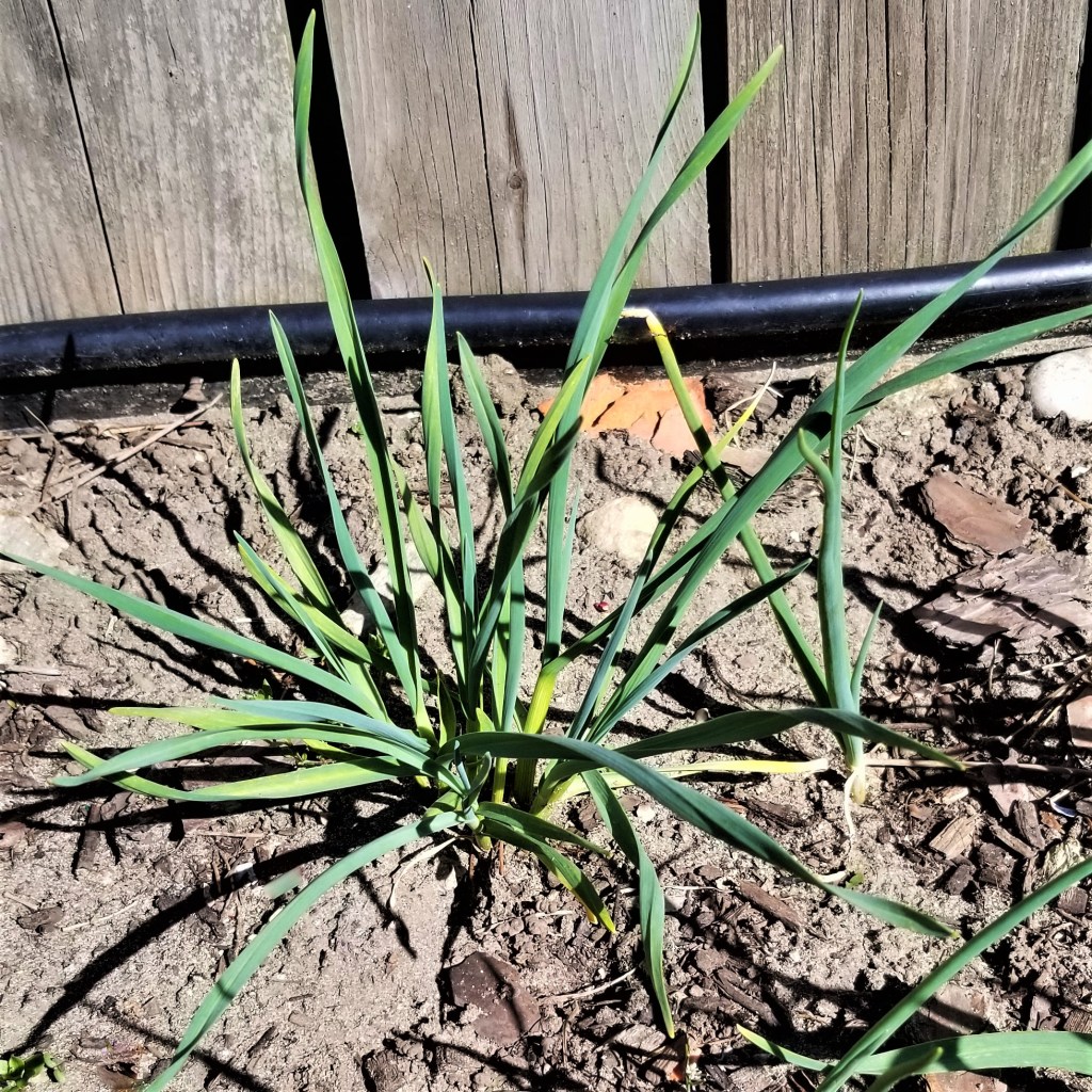 After a cold and stormy start to the spring season, we are enjoying a few days of summer-like weather here in Southern Ontario. I sowed a row of peas a couple of weeks ago, and they are now sprouting (photo at the top of this post). As I ventured to clean some brush in the garden beds, I spotted a few more crops. The garlic and shallots that I sowed last fall look healthy, with bright green tops already a few inches tall: