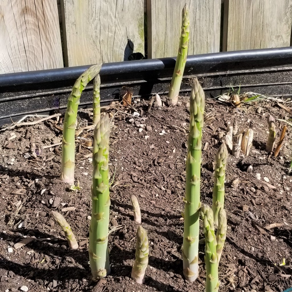 Some asparagus are ready for harvest, and the shoots keep popping out: