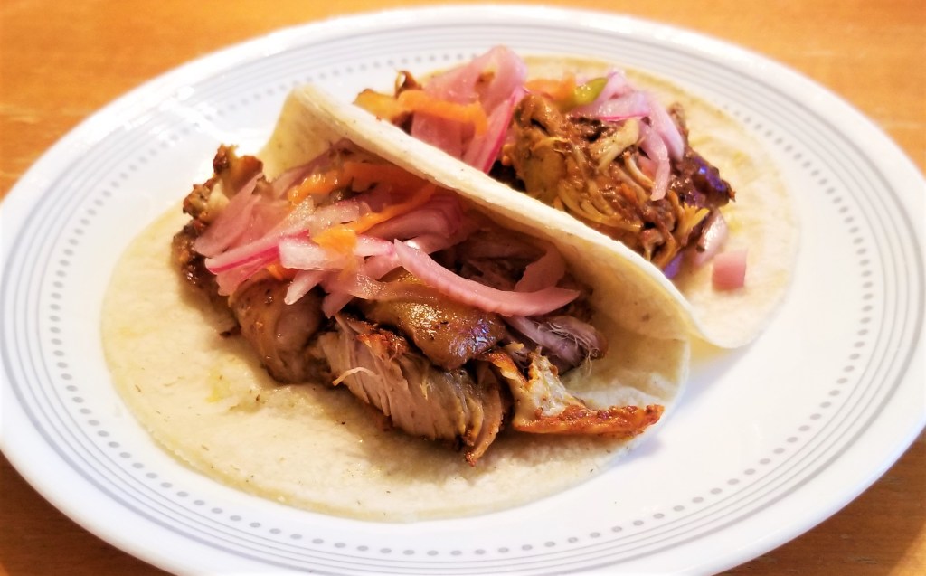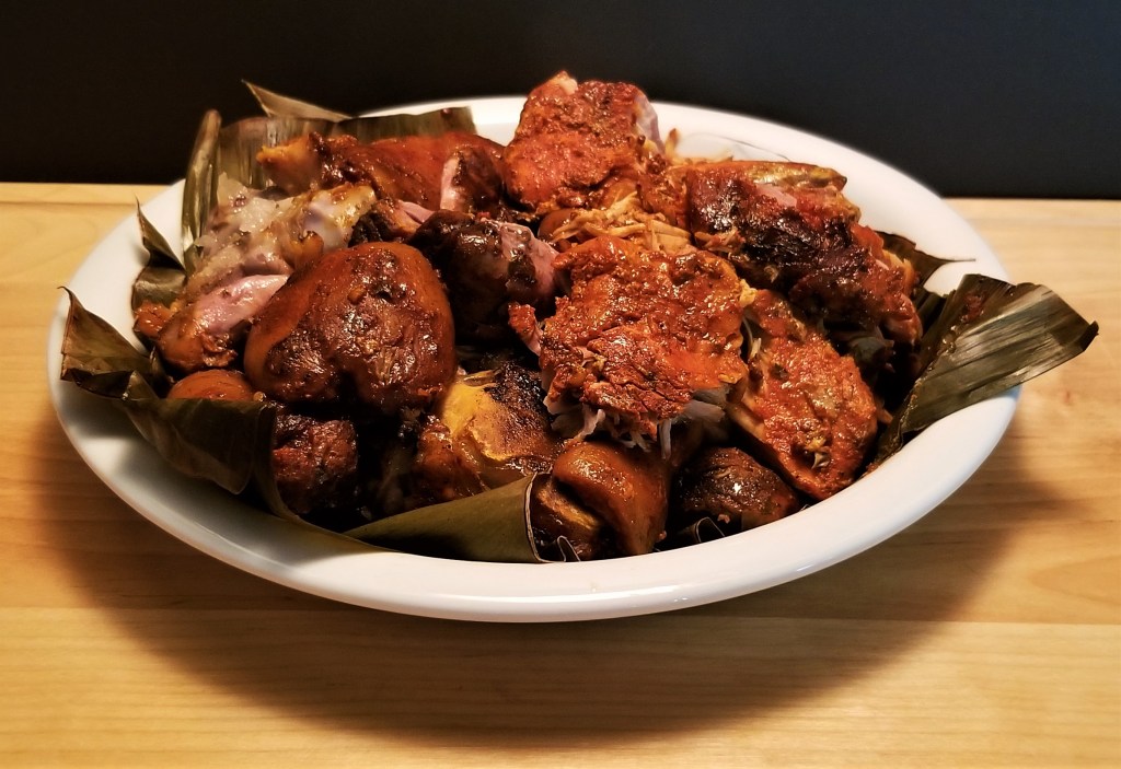 The third suggestion is the flavourful Cochinita Pibil, from the Yucatan peninsula, in Mexico’s South East.  Cochinita means “small pig”, and Pibil refers to the method of cooking in a piib, which is a pit where food is slow-cooked buried in a bed of hot coals and rocks, and sealed with dirt, generally wrapped in banana leaves, used in the Yucatan peninsula and some parts of Central America to this day and since pre-Hispanic times. Because the annatto-based rub called recado rojo, or sometimes pasta de achiote, is often used to condiment food cooked in the piib, the name “pibil” is given to dishes with that seasoning, even though nowadays many are prepared in a regular oven, over the stove, or in this case, as I have praised as the best substitute for the piib, a slow cooker:
