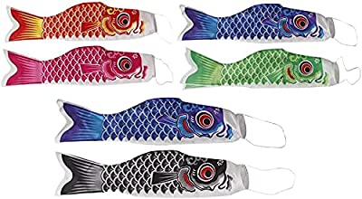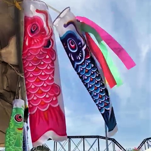 The most distinctive symbols of Kodomo no Hi are the flying carps – Koi no Bori, fabric windsocks shaped as carps in bright colours that are aligned and hung outside houses, usually one for each member of the family. The flying carps were present as decorations at the venue: