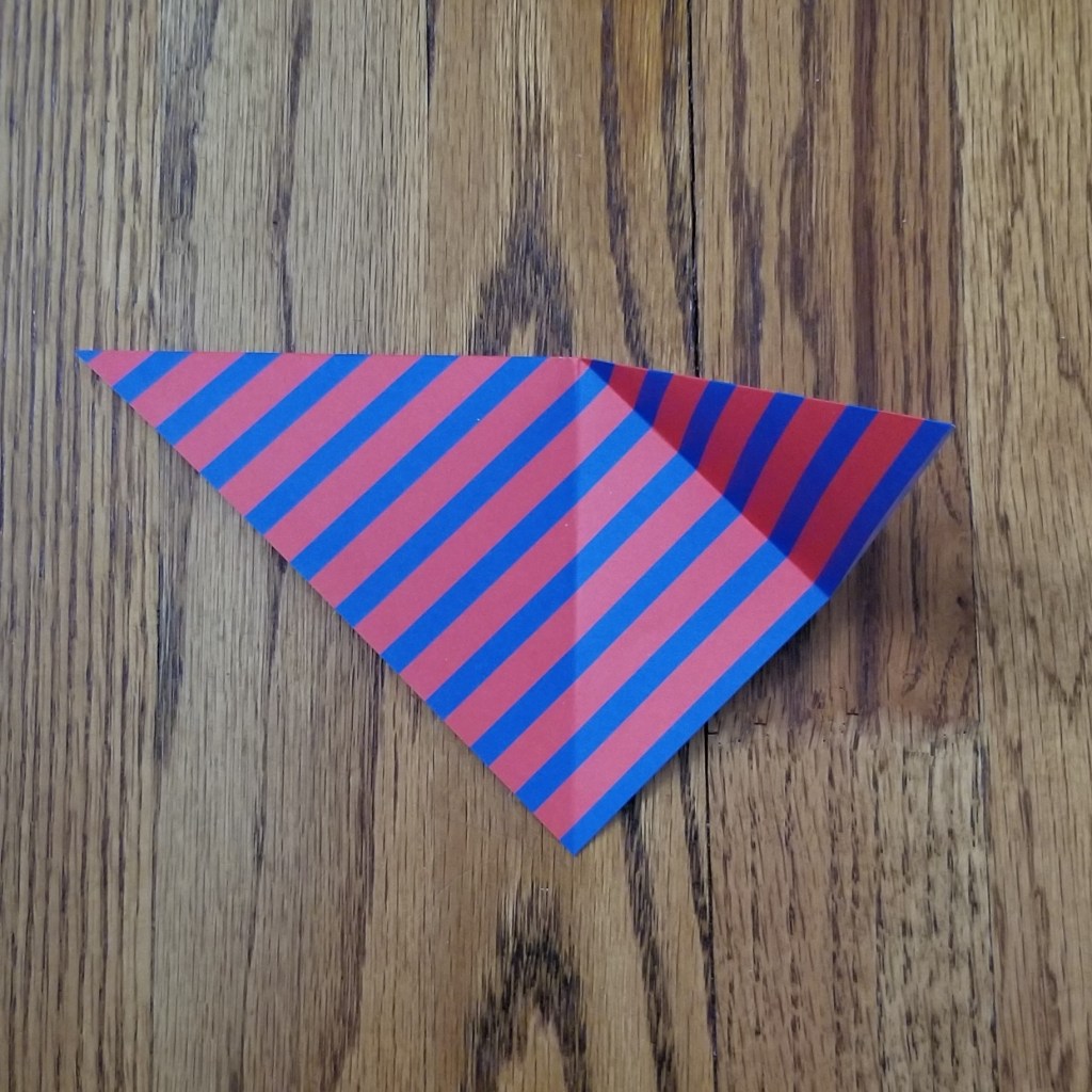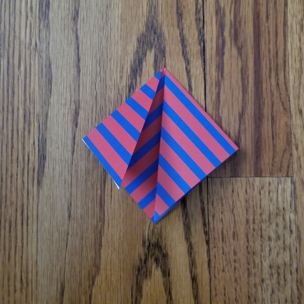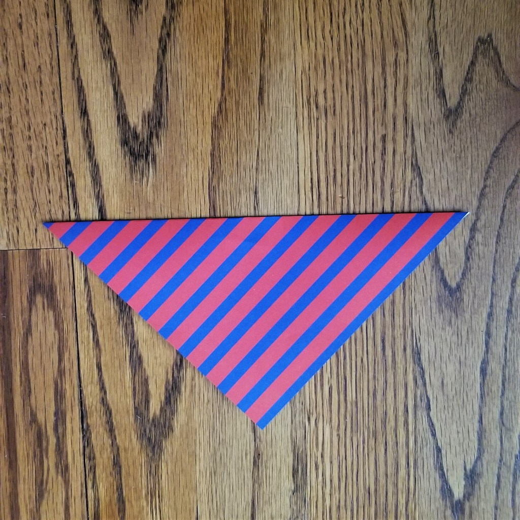 If the paper has a blank side, start with that side facing up, with a corner pointing towards you (bottom of photo below, left). Take the opposite corner to meet the bottom one, and fold the square into a triangle (photo below, centre). Take the left corner, and make it meet the right one, to form a smaller triangle (photo below, right):