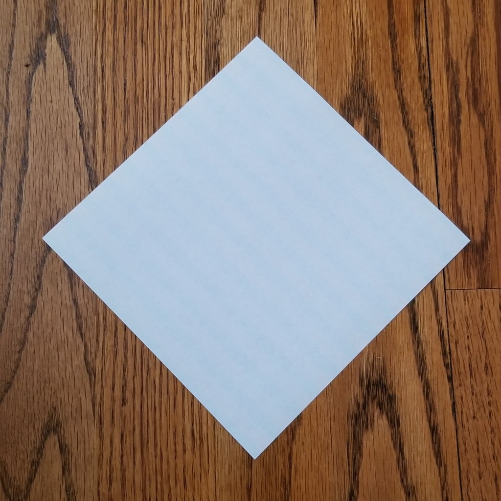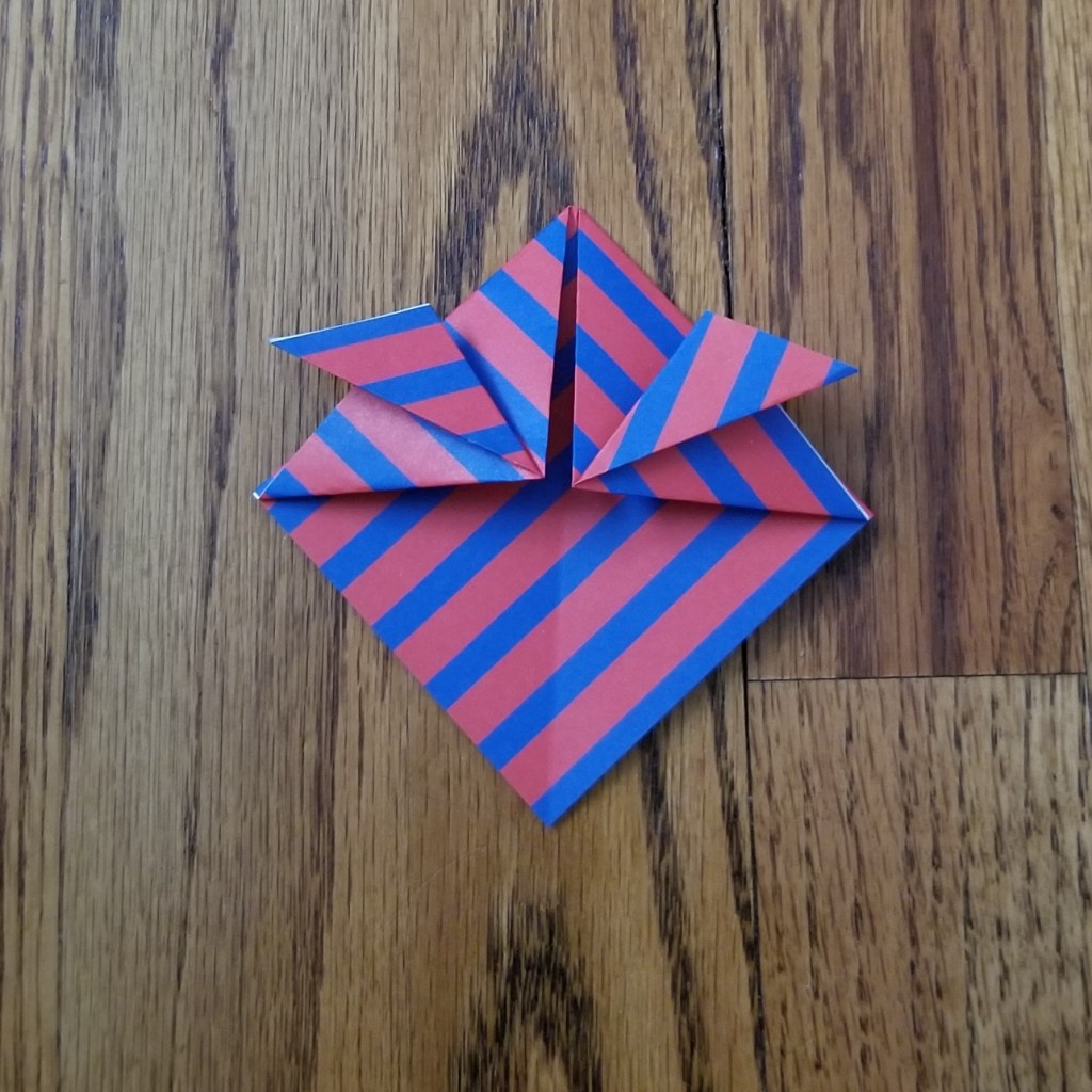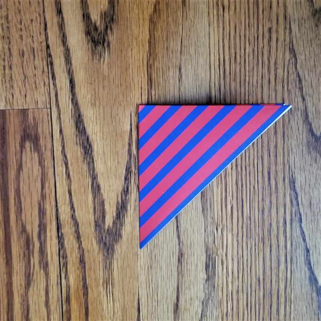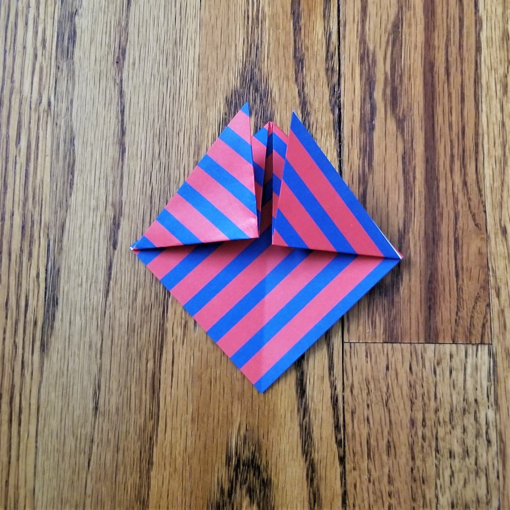 If the paper has a blank side, start with that side facing up, with a corner pointing towards you (bottom of photo below, left). Take the opposite corner to meet the bottom one, and fold the square into a triangle (photo below, centre). Take the left corner, and make it meet the right one, to form a smaller triangle (photo below, right):