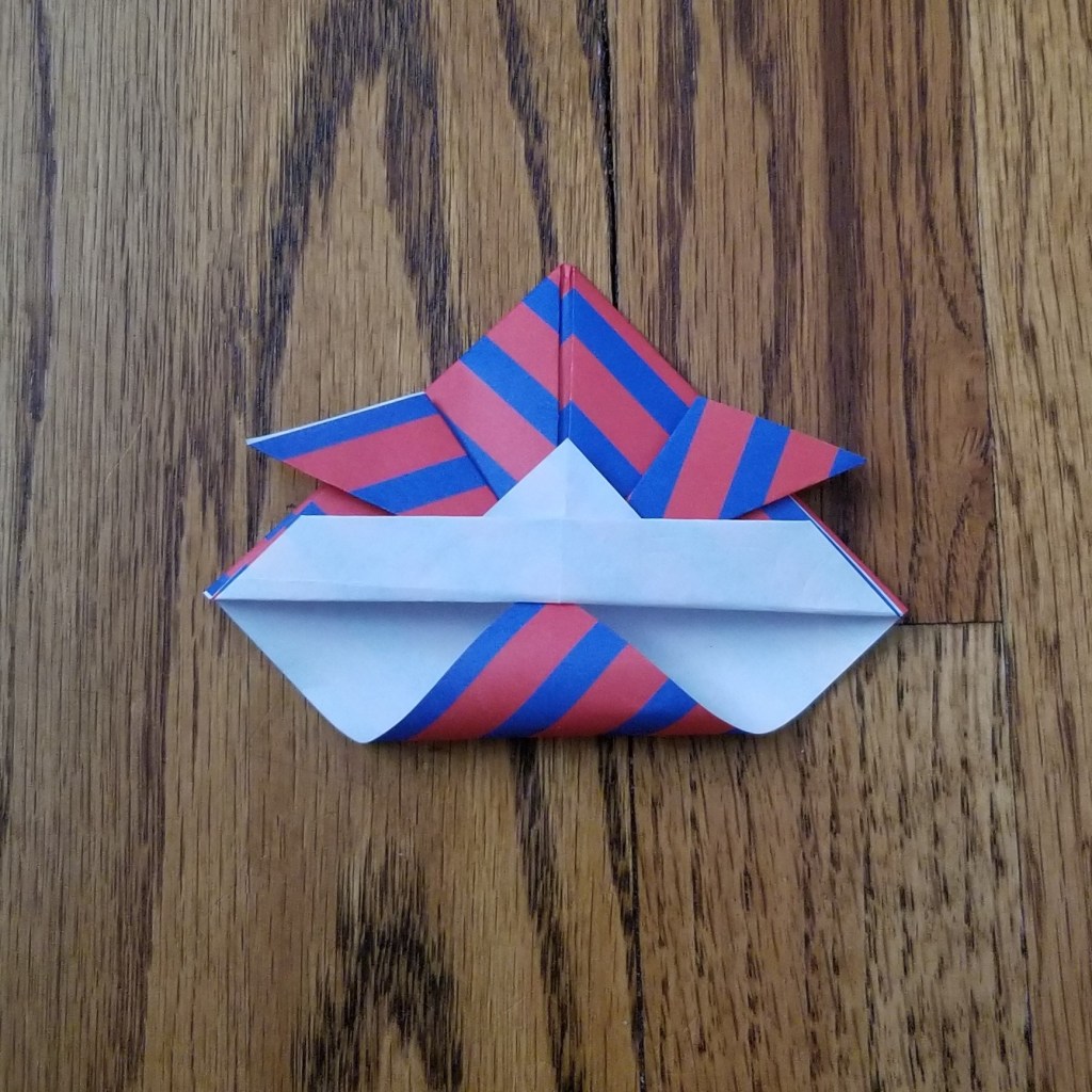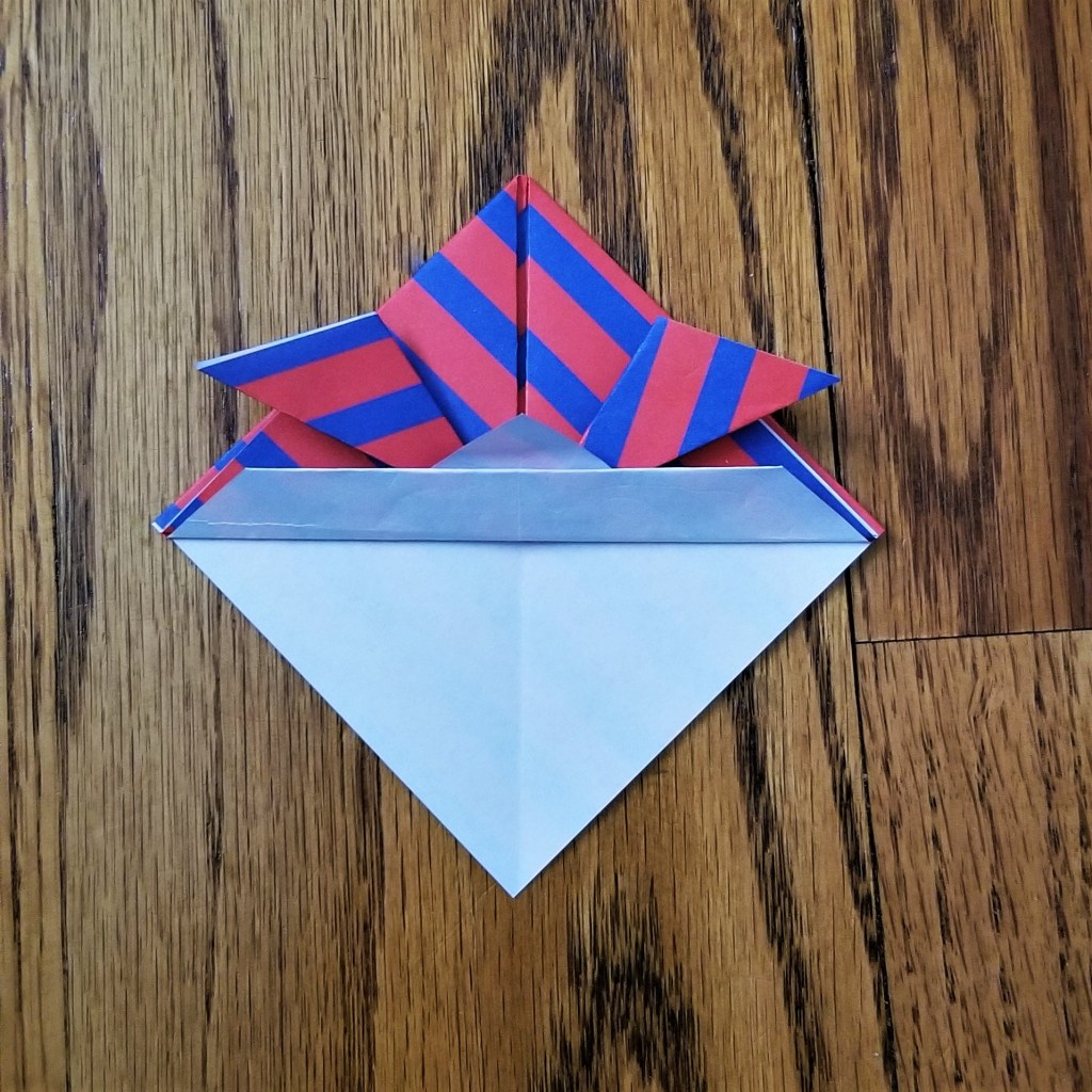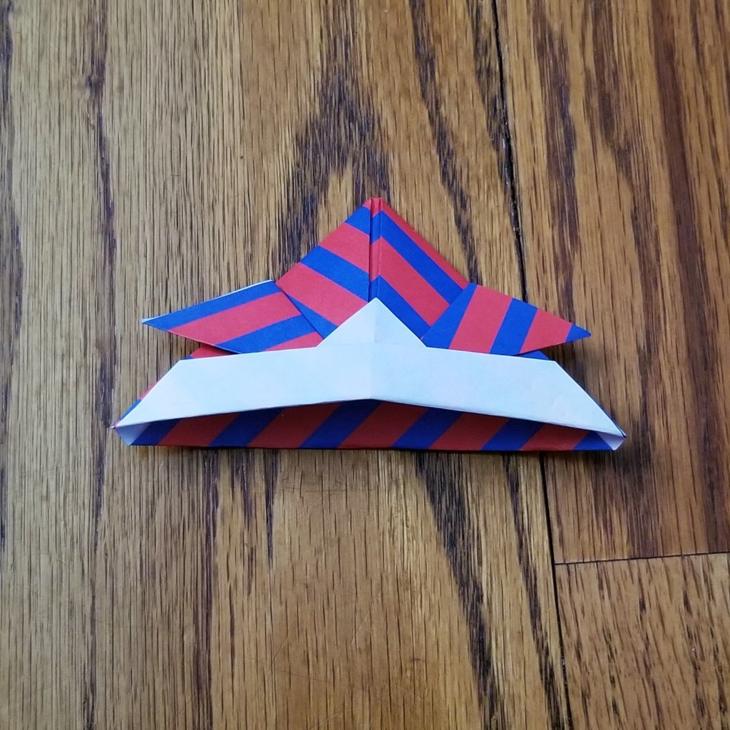 Take the second layer of paper from the bottom, and tuck it inside the helmet (photo below, left); continue pushing, to line the inside of the back side of the helmet (photo below, centre). The finished product is a nice Origami Kabuto (photo below, right):