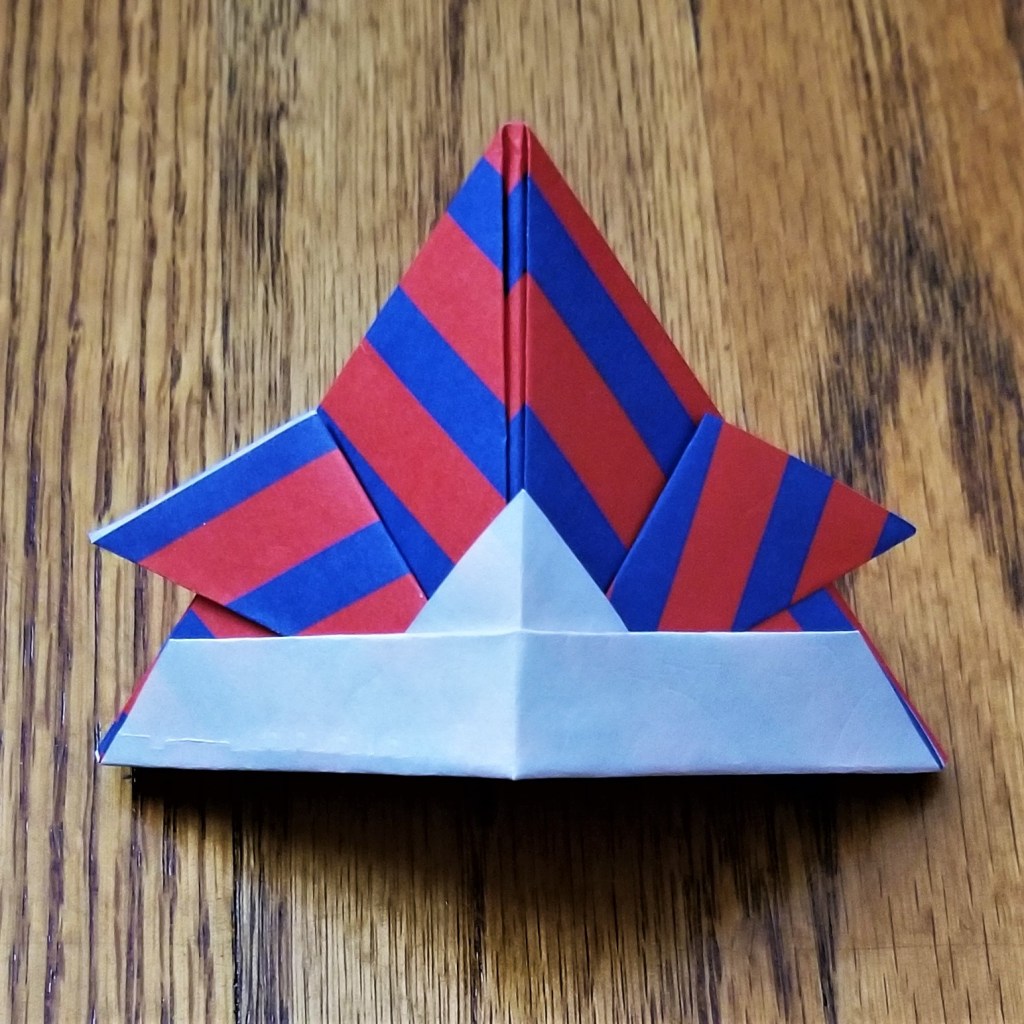 Make narrow folds outwards, as shown in the photo below, left. Now take one layer from the bottom and fold it about halfway up, showing the blank side as a triangle (photo below, centre). Fold again to form helmet rim (photo below, right):