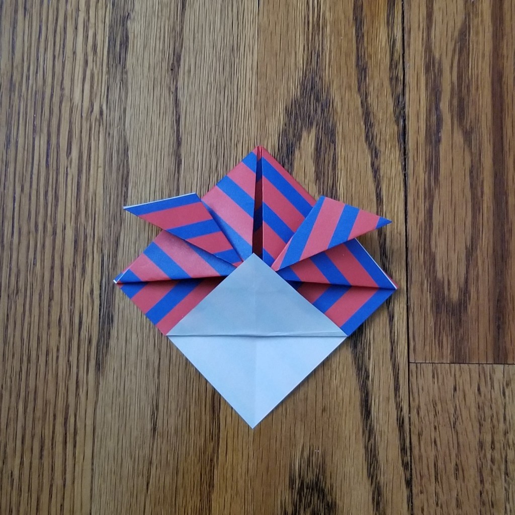 Undo the second fold, and use the mark in the middle as a guide, to bring the side corners to meet the bottom (photo below, left). Take one corner (photo below, centre), and fold it up; repeat with the other corner (photo below, right):