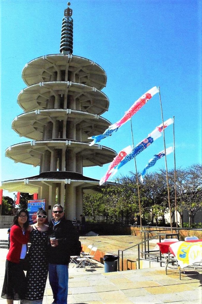 In 2015, my husband was attending a conference in California, and after that, our daughters and I joined him in San Francisco for a family vacation. It just so happened that we were visiting their Japan Town on May 5, and the Japanese community was holding a fun festival for all the children; my older daughter took the photo below, of me, my younger daughter, and my husband, in front of the Peace Pagoda, and a few flying carps – Koi no Bori: