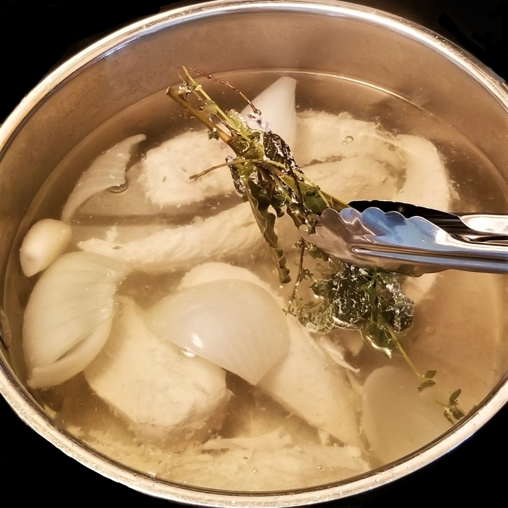 Place meat, onion, one garlic clove and herbs in a pot with enough water to cover ingredients (photo below, left). Bring to boil on high heat, then reduce to a simmer; skim and discard foam (photo below, right):