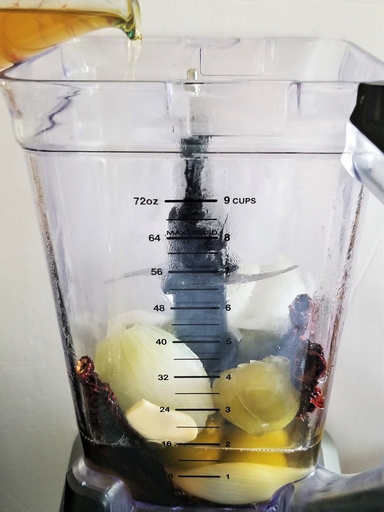 Allow to cook until tomatillos start to change to a darker green tone, and pasilla peppers are soft. Turn off heat and allow to cool down for a few minutes. Remove and discard seeds and stems from peppers, and transfer to a blender jar, along with the tomatillos, onion, and garlic from the pot; add half a teaspoon of salt, the second clove of garlic (raw), and one cup of broth from the pot (photo below, left). Process for around one minute, until smooth (photo below, right):