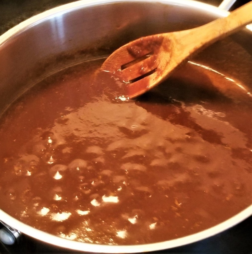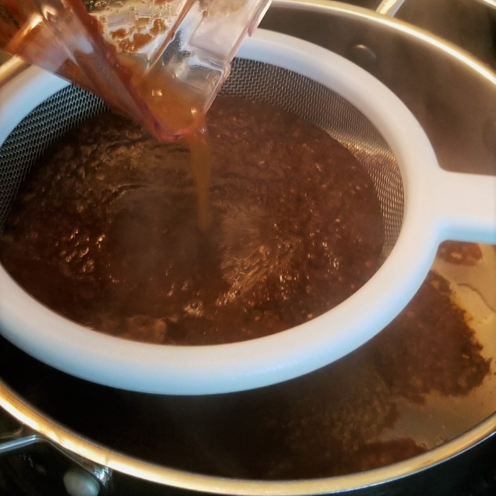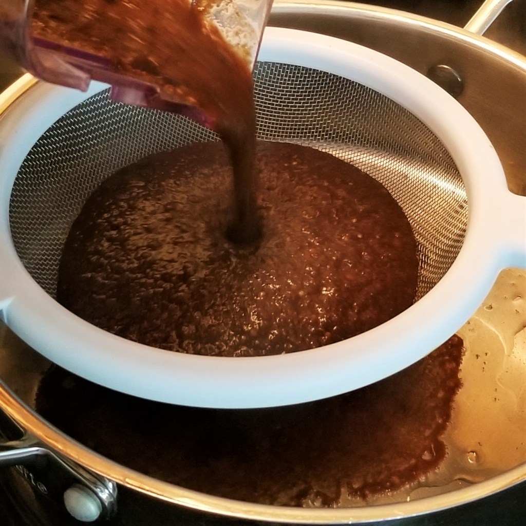 Warm up oil in a pot over medium heat, then add sauce from the blender, straining through a sieve (photo below, left). Add another cup of broth to the blender jar, to collect any sauce, and pour through the sieve, into the pot, as well (photo below, right):