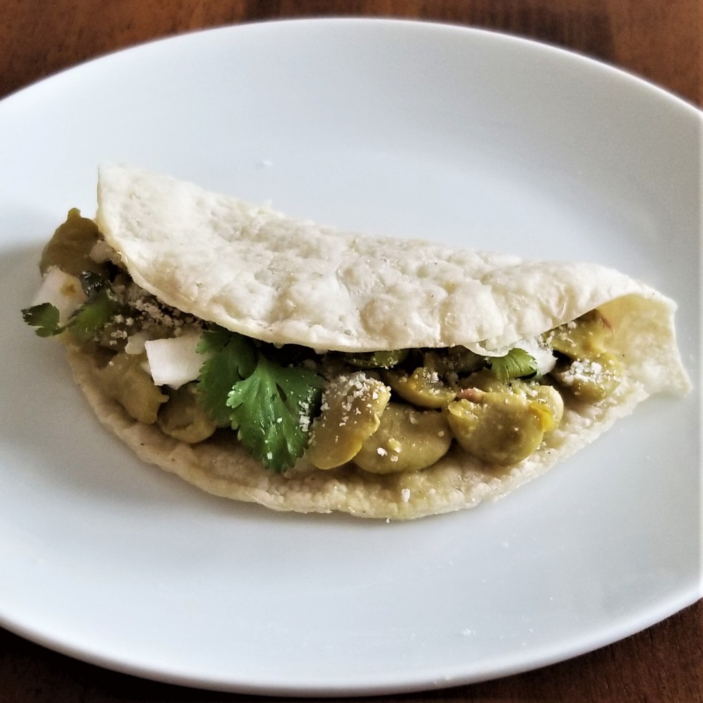 Although mezcal and aloe were used as a substitution for pulque, I think the pretense worked well enough, imparting a lightly sweet and unique flavour to the humble broad beans. This simple dish may also serve as a light lunch, supplemented with crumbled cheese, and fixed as a taco in a warm corn tortilla:
