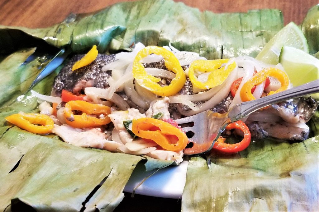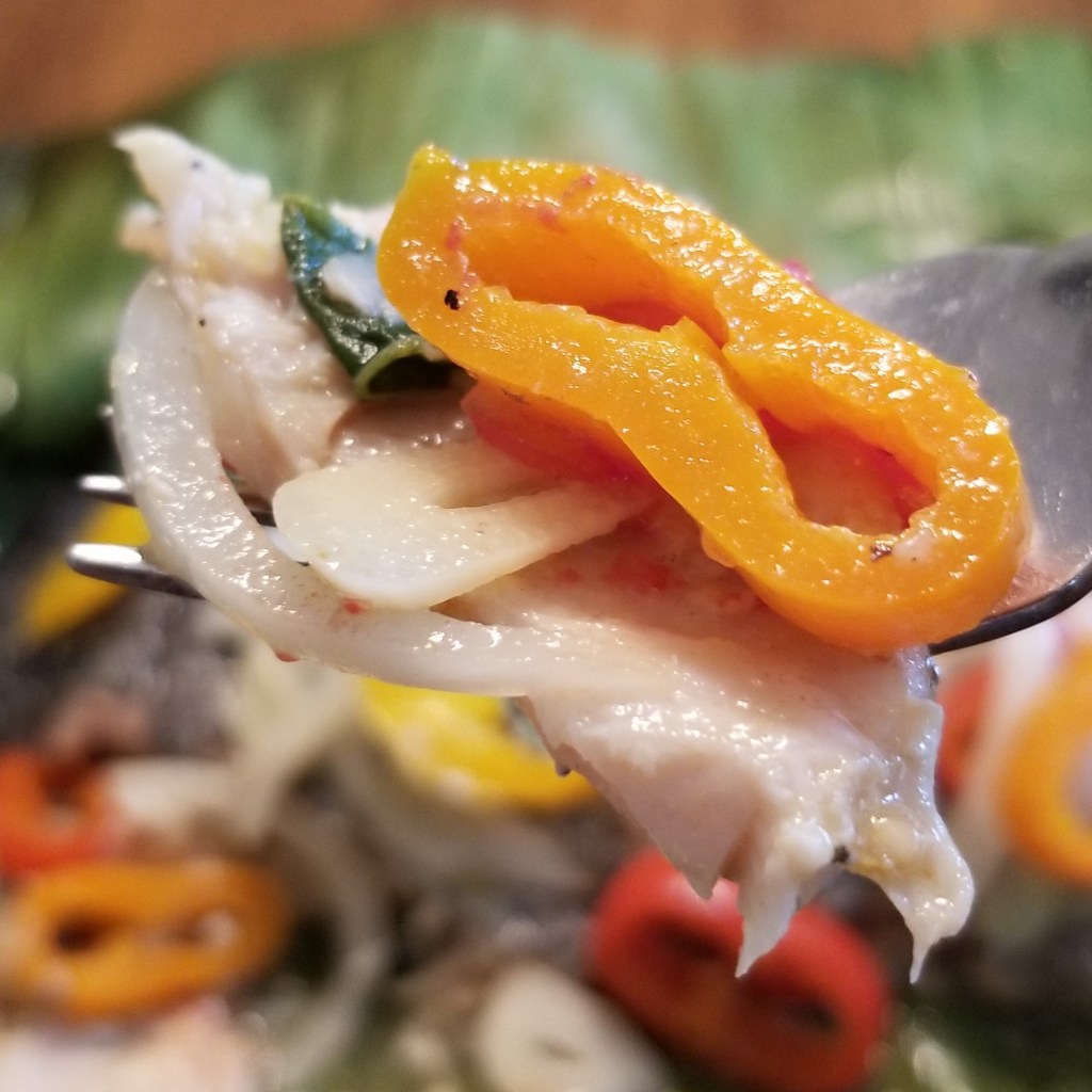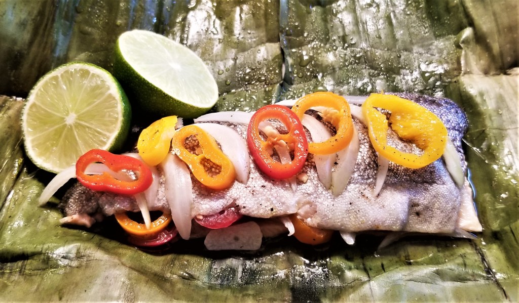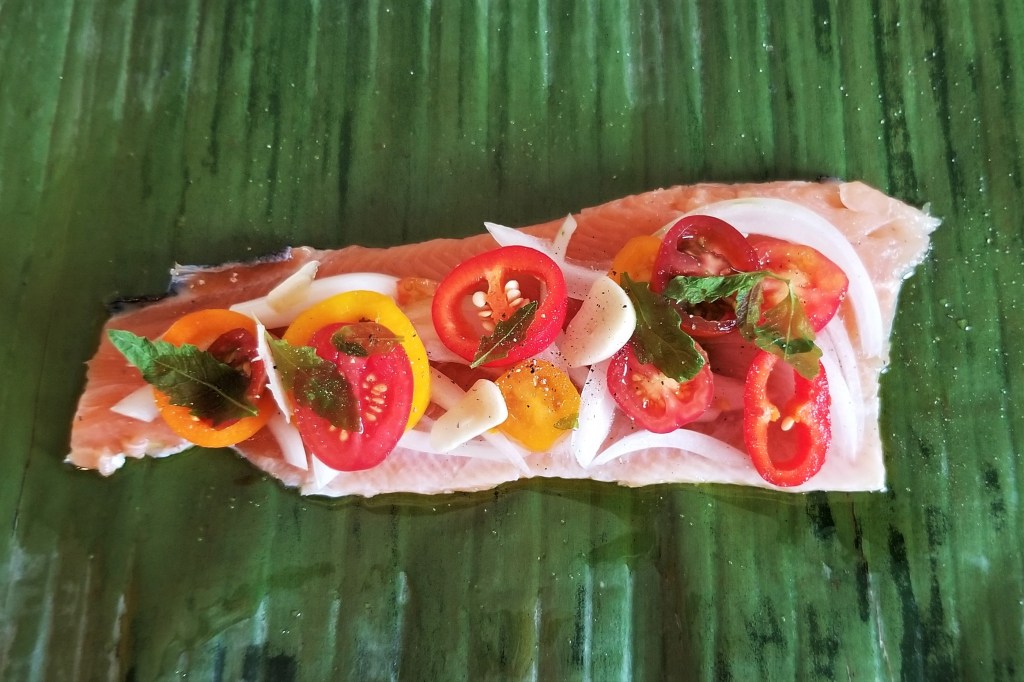 Repeat with the last banana leaf, second fish (or two filets), and the rest of the veggies and epazote: