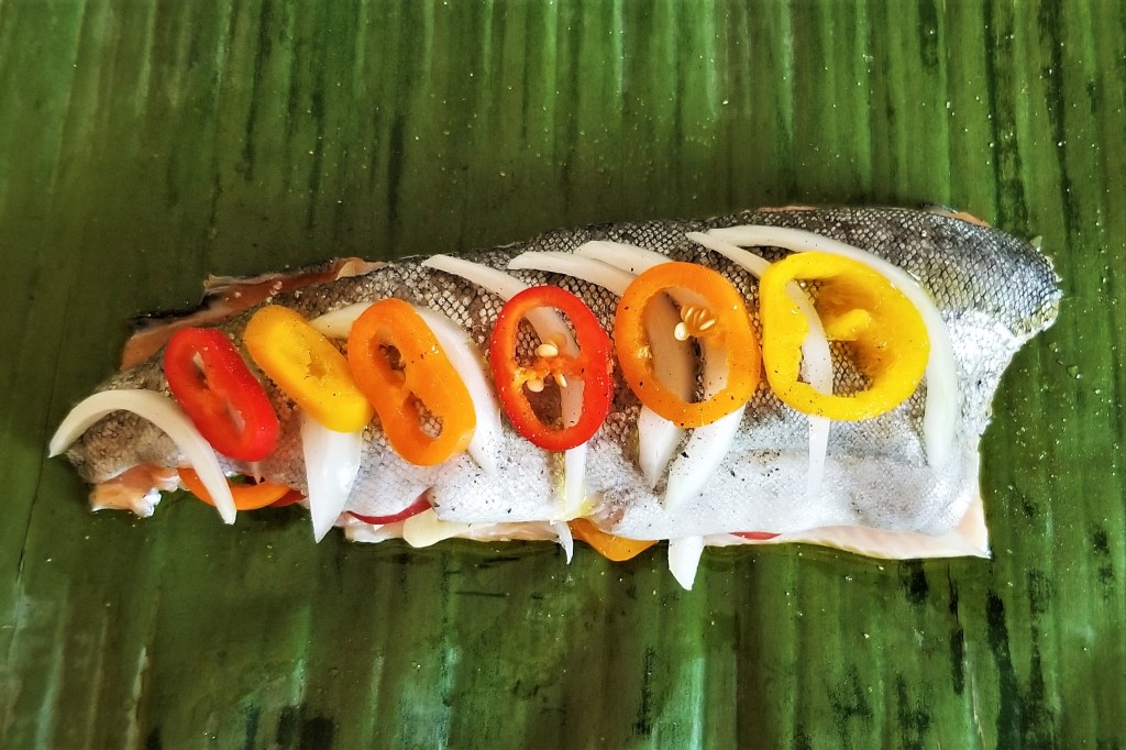 1. In some versions of this recipe, the packets are cooked on a griddle over a woodfire, so you get a lot of the banana leaf flavour; baking in the oven, I think the added flavour is marginal, but the fish looks so pretty on the natural leaves, doesn’t it?