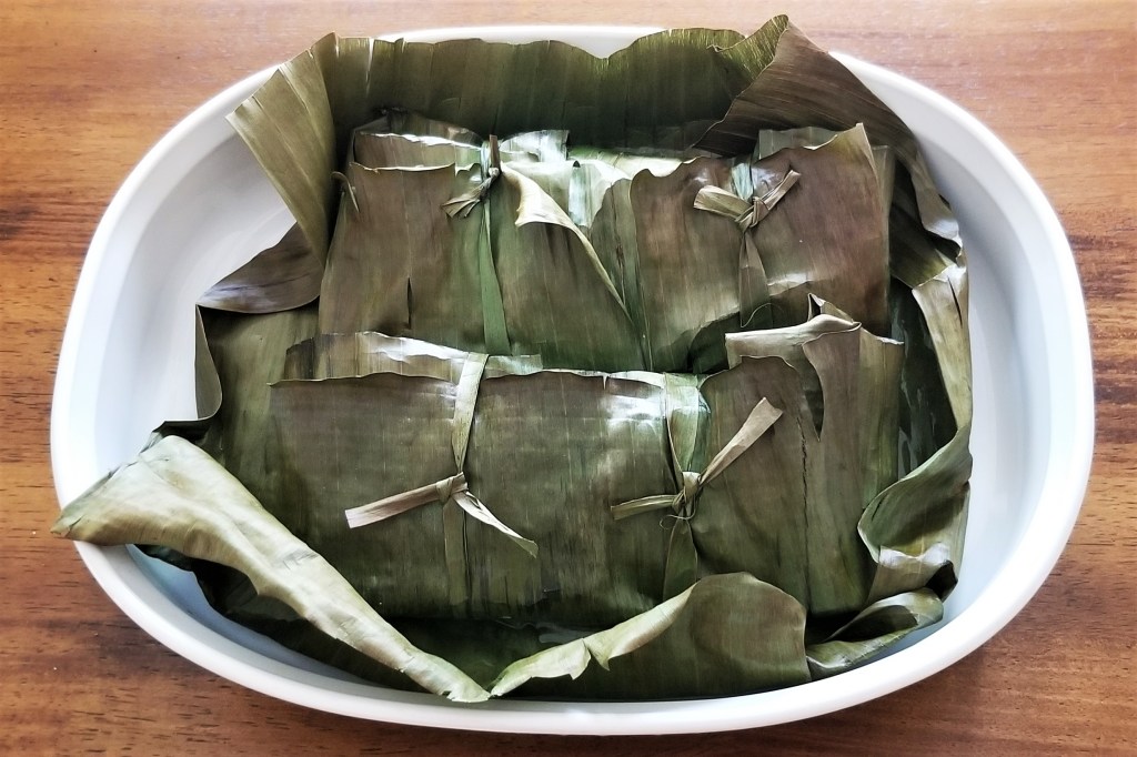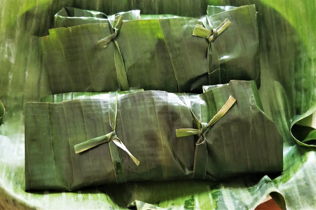 Fold bottom banana leaf over the packets, then bake in pre-heated oven for twenty five minutes.  Remove from oven and uncover packets: