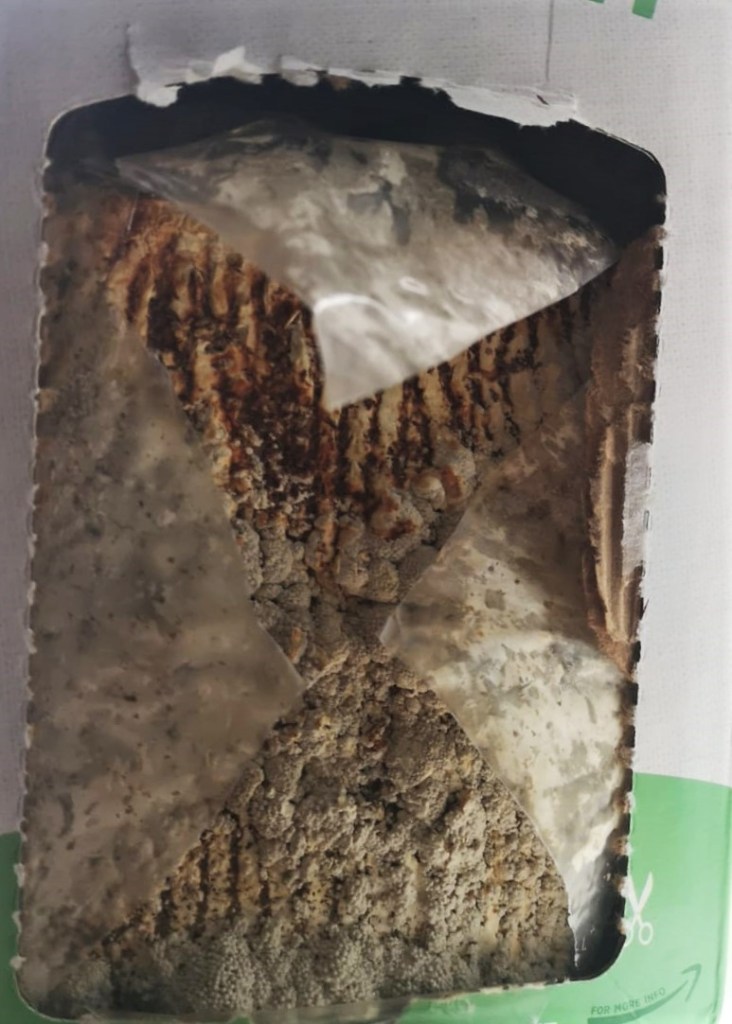 These particular kits came in a self-contained format, inside a box with a plastic sheet on one side, and a spraying bottle. The “farmer” only needs to cut an “X” on the plastic sheet, place the box in indirect light, and start spraying the growing surface with water.   One box was for the familiar grey oyster mushrooms (Pleurotus ostreatus).  After a few days, some texture appeared (photo below, left); it did not look very flattering, but from that point, the mushrooms grew, as seen below in the second to fourth photos, taken respectively two, three and four days after the first one: