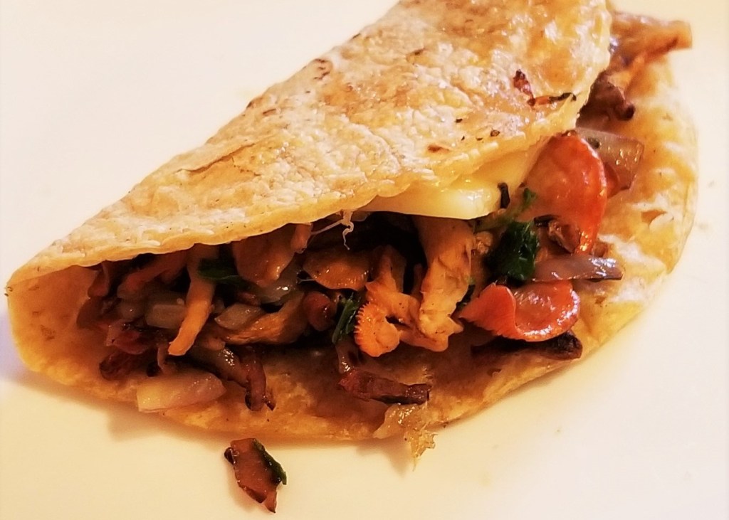 The slide show below, shows one mushroom cooked in tempura batter, several on focaccia dough with truffle salt right before hitting the oven, a few as a topping on melted cheese tacos, and finally, a batch that was stir-fried as a filling for quick quesadillas: