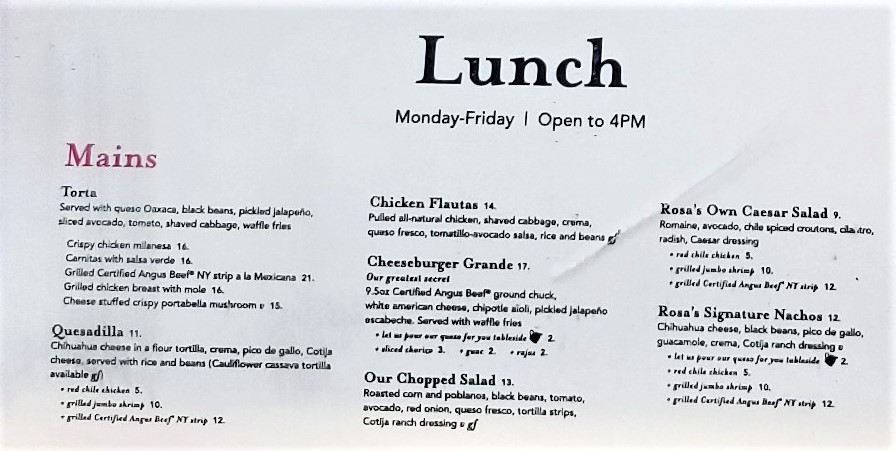 Throughout the years, other restaurants under the Rosa Mexicano brand were founded, in New York, and other US cities, and Ms. Howard continued her involvement until her passing in 2005. As stated on their website, they continue their founder’s vision of bringing upscale dining that honours Mexican cuisine, with influences from contemporary and global trends. In the photo below, the Menu at Rosa Mexicano, National Harbor, MD: