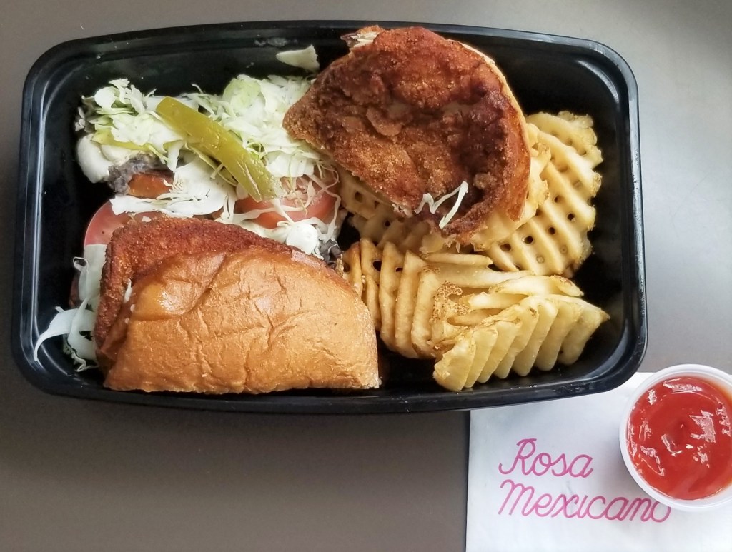 I chose the torta with crispy chicken milanesa (a breaded cutlet); the description said that it came with queso Oaxaca (string Mexican cheese from Oaxaca), black beans (refried) and sliced avocado, which were inside the bun along with the breaded chicken, as well as pickled jalapeño, shaved cabbage, tomato, and waffle fries, which were served on the side, including a small portion of ketchup, as well: