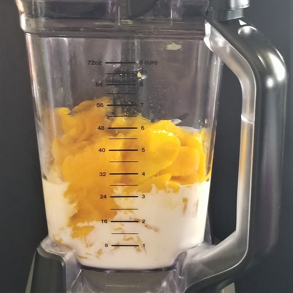 Place cream, milk and sugar in a blender jar, and add reserved mango (photo below, left). Process until smooth (photo below, right):